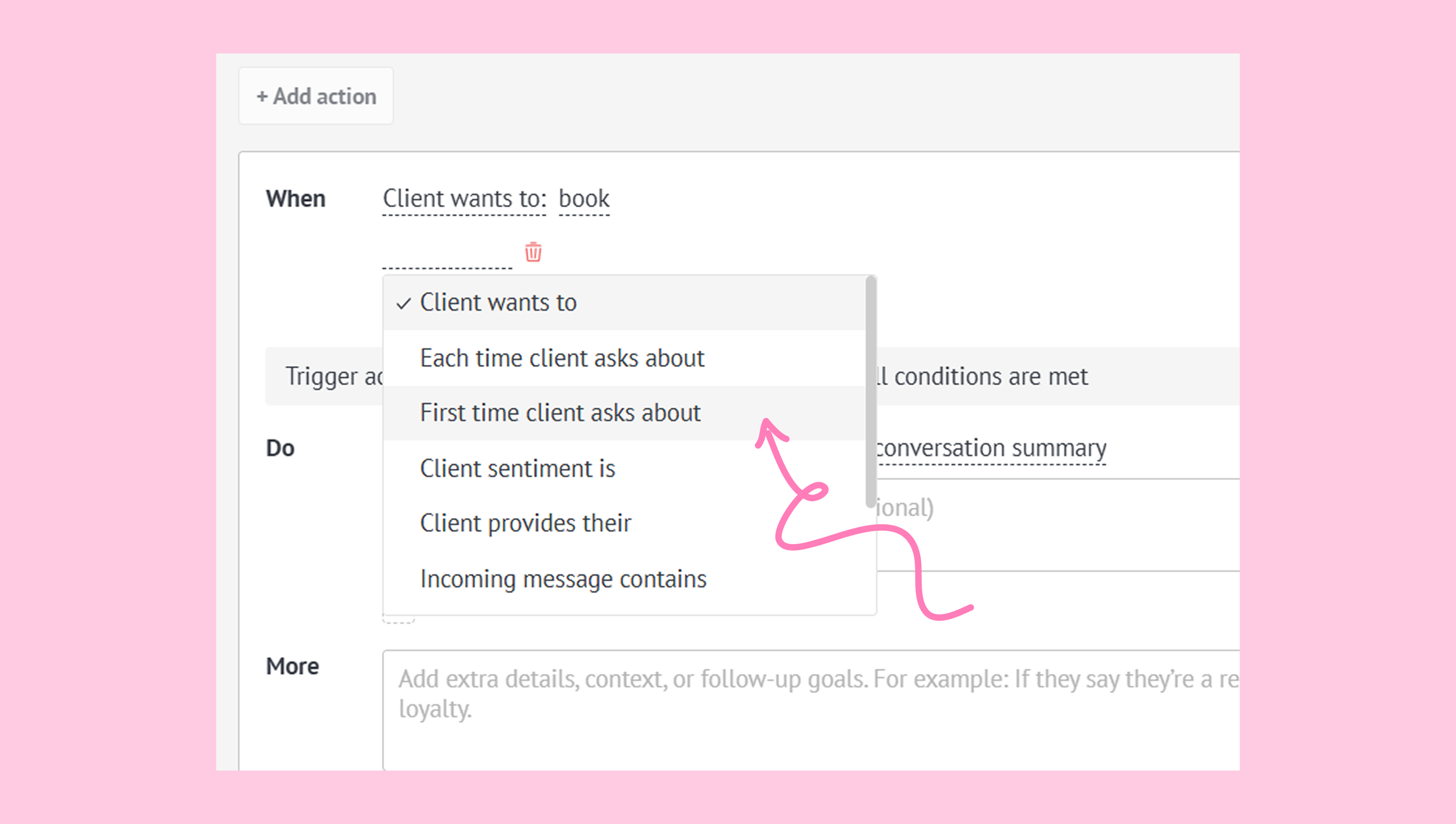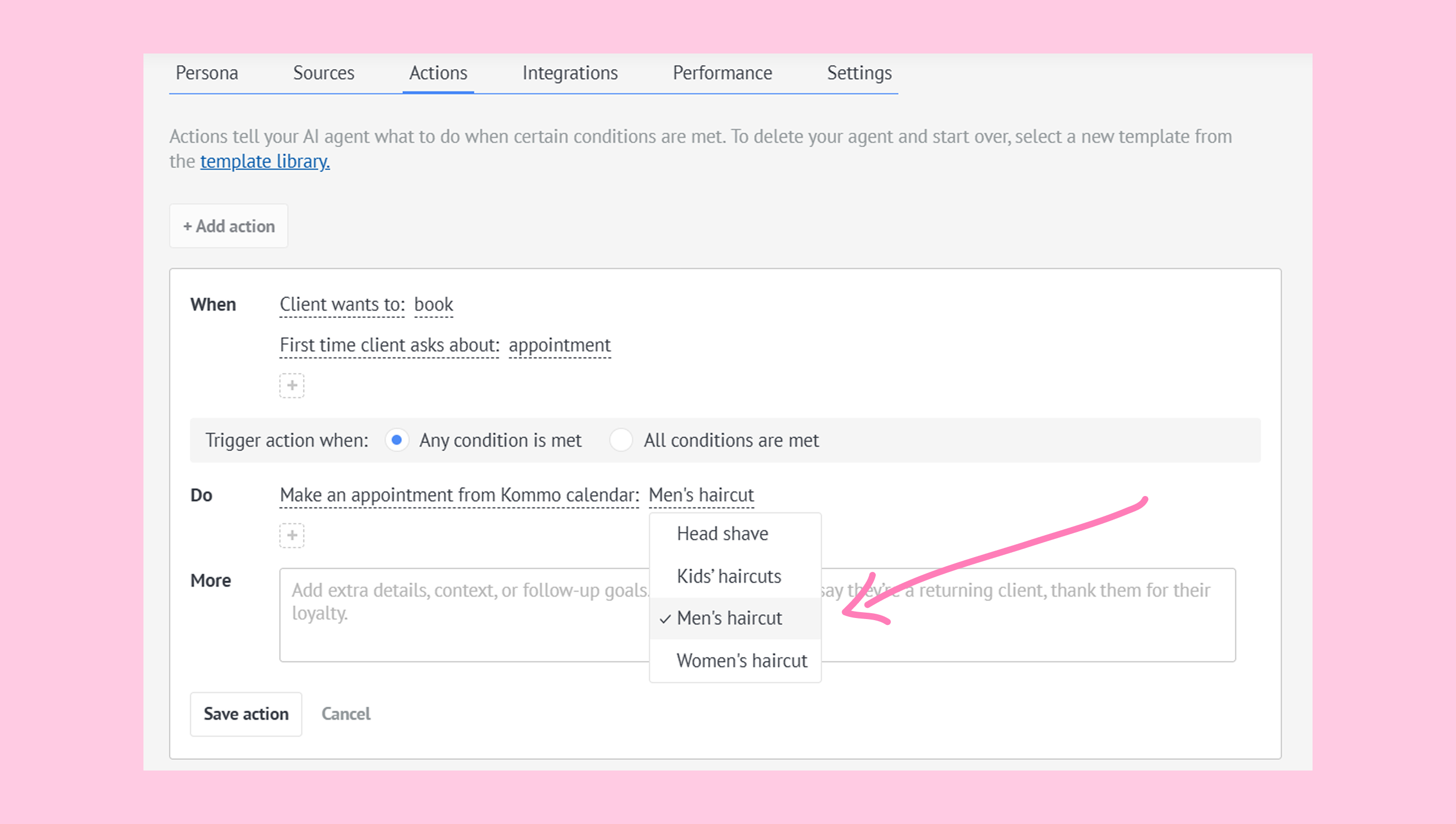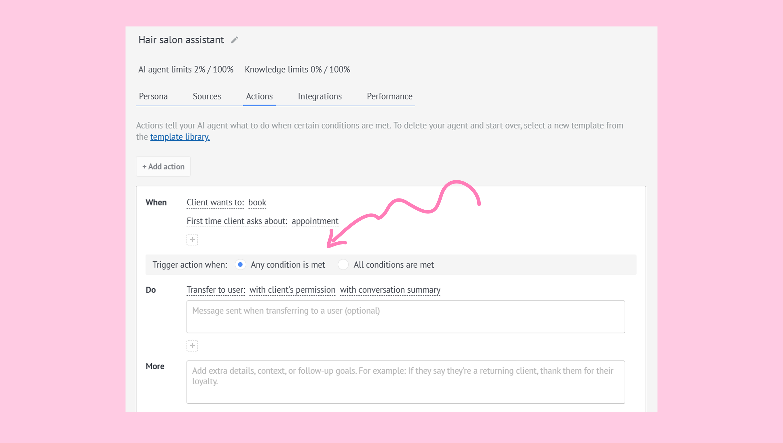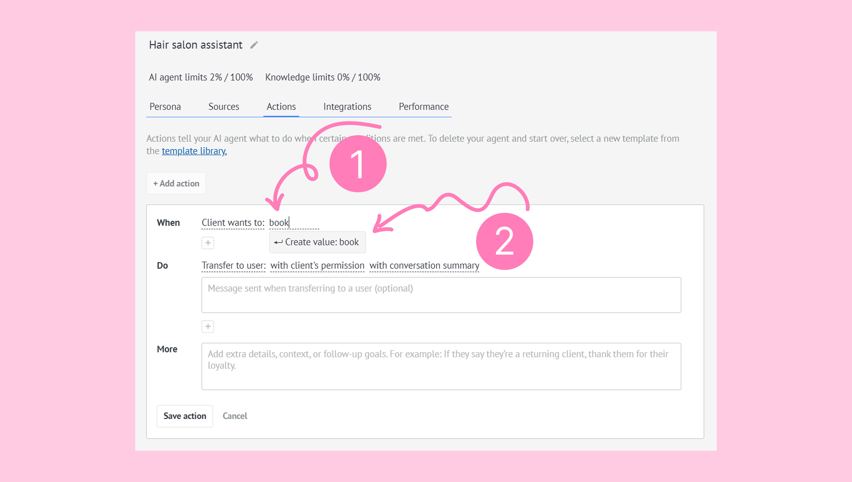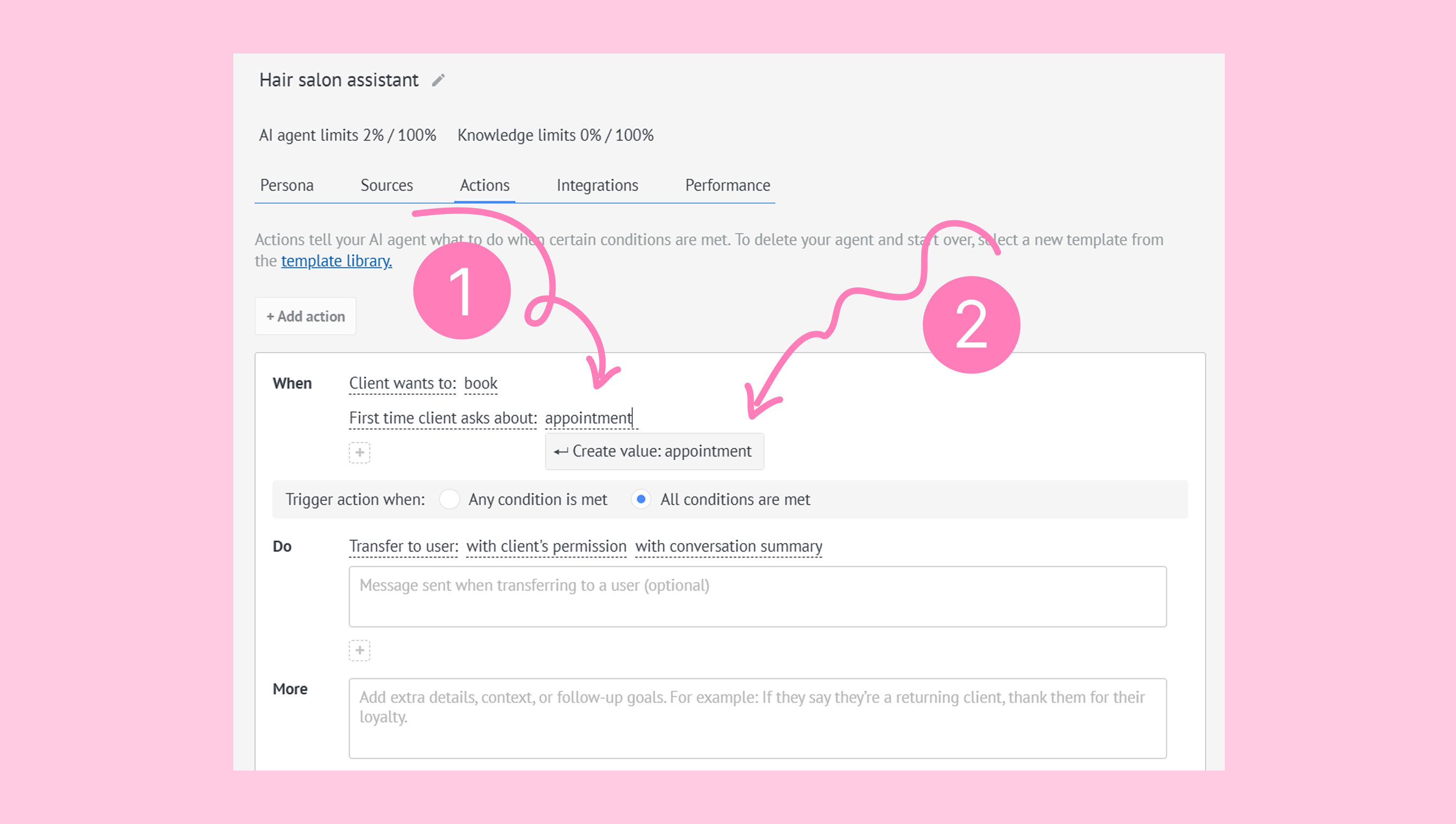 Go to AI Agent and open the Actions tab. Click + Add action.