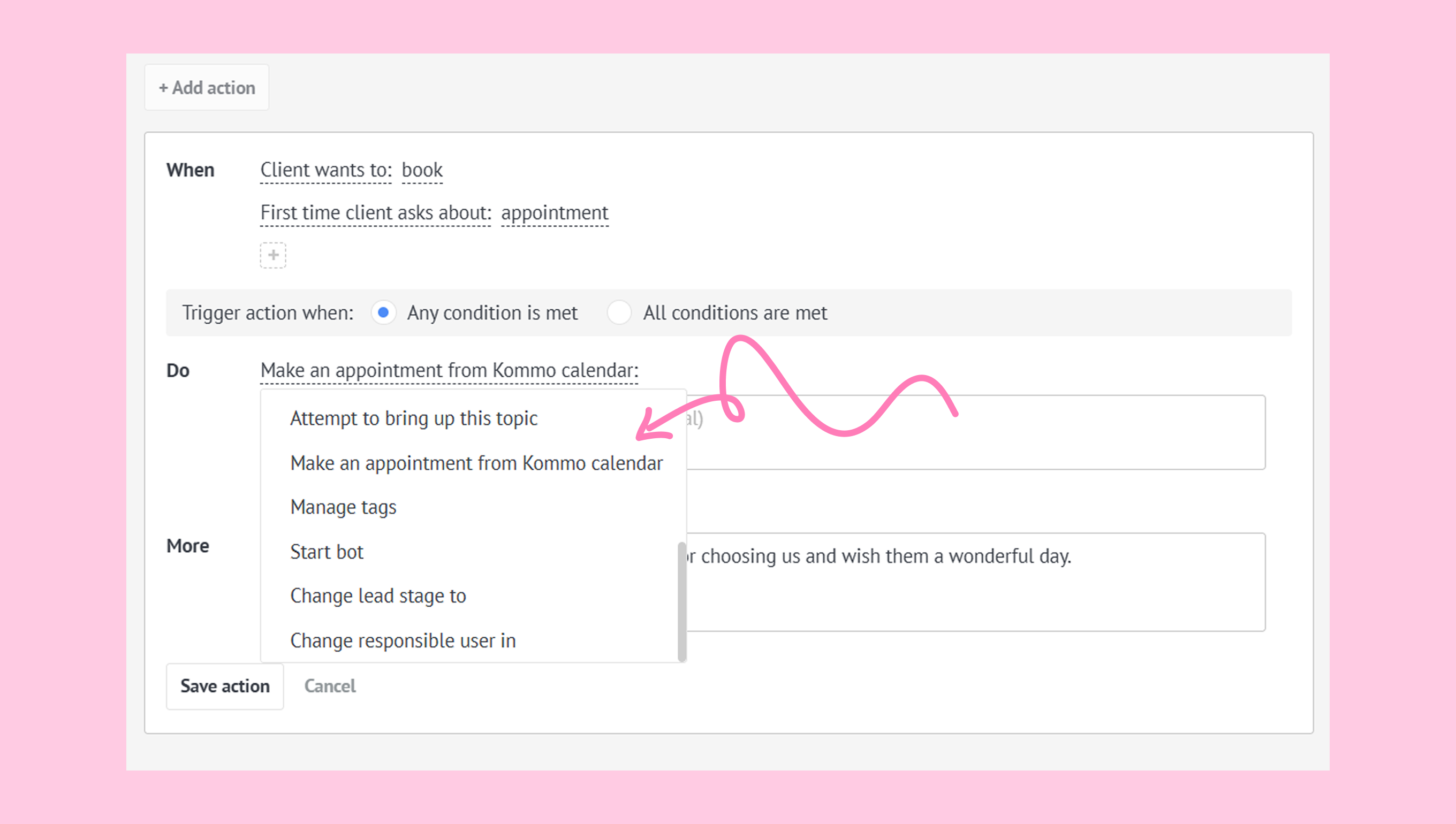 Set up the DO setting by clicking Transfer to user and selecting Make an appointment from Kommo calendar.