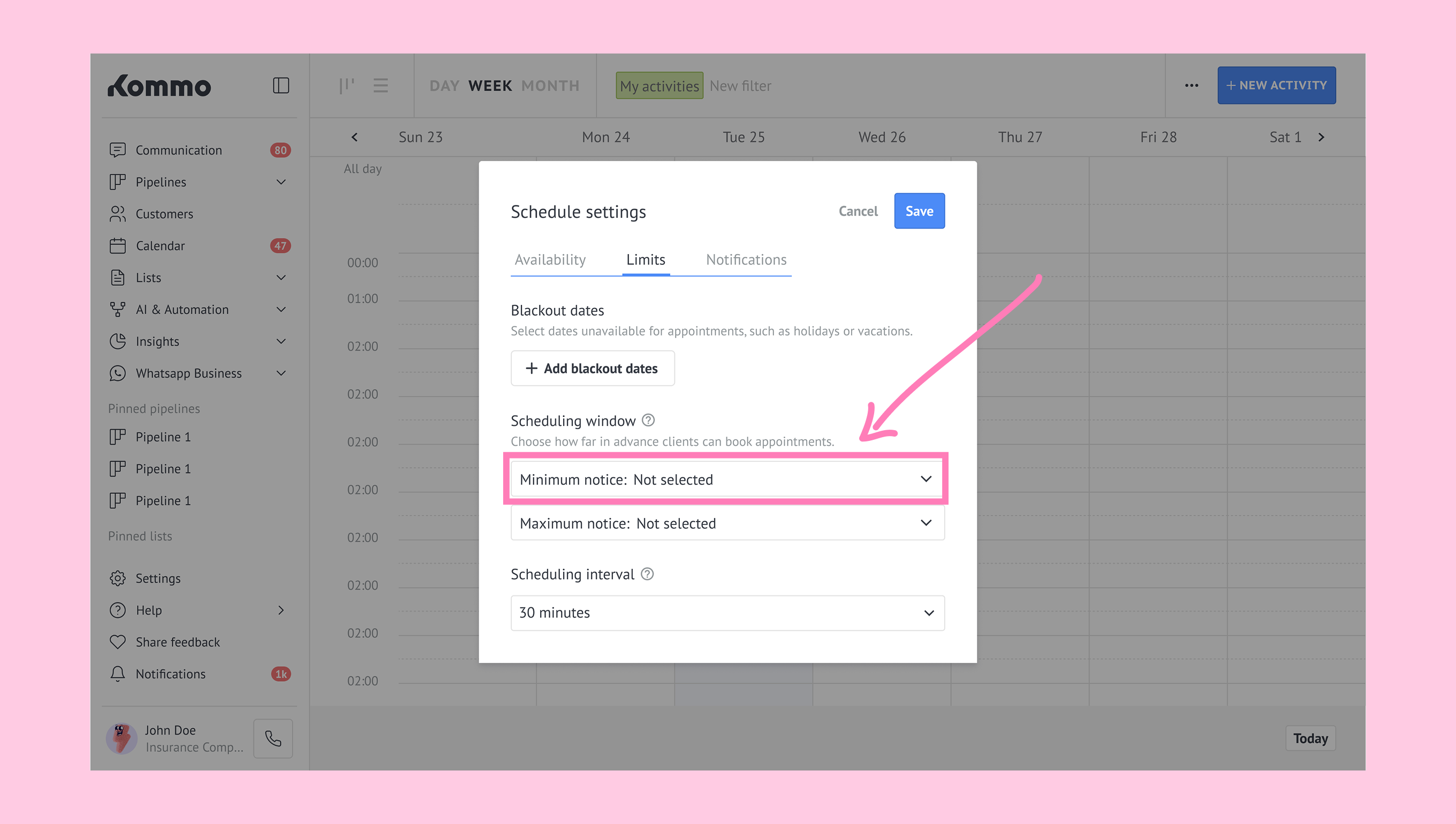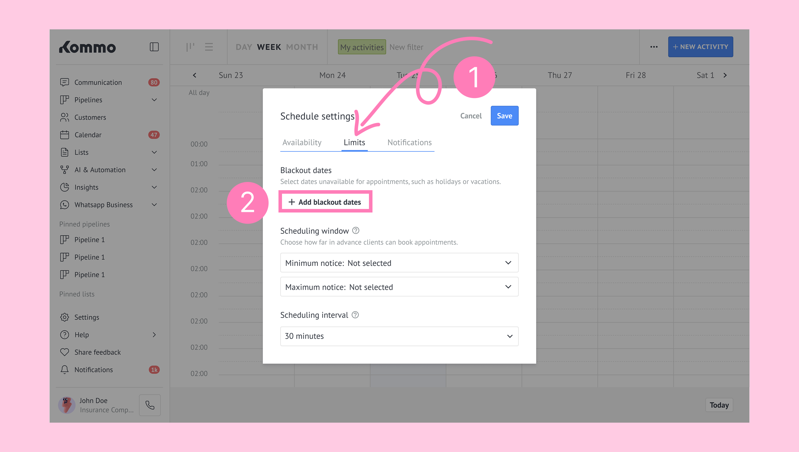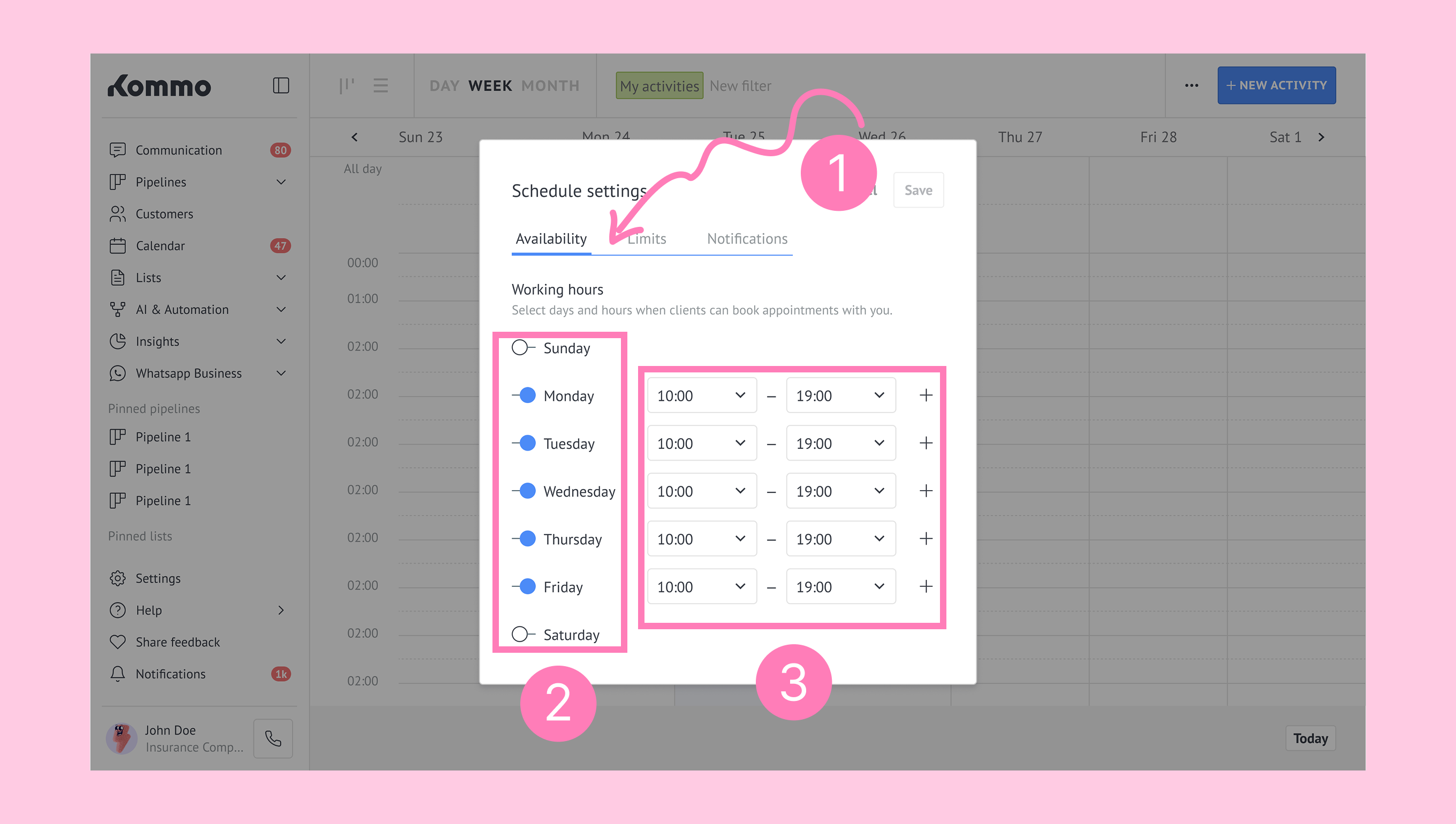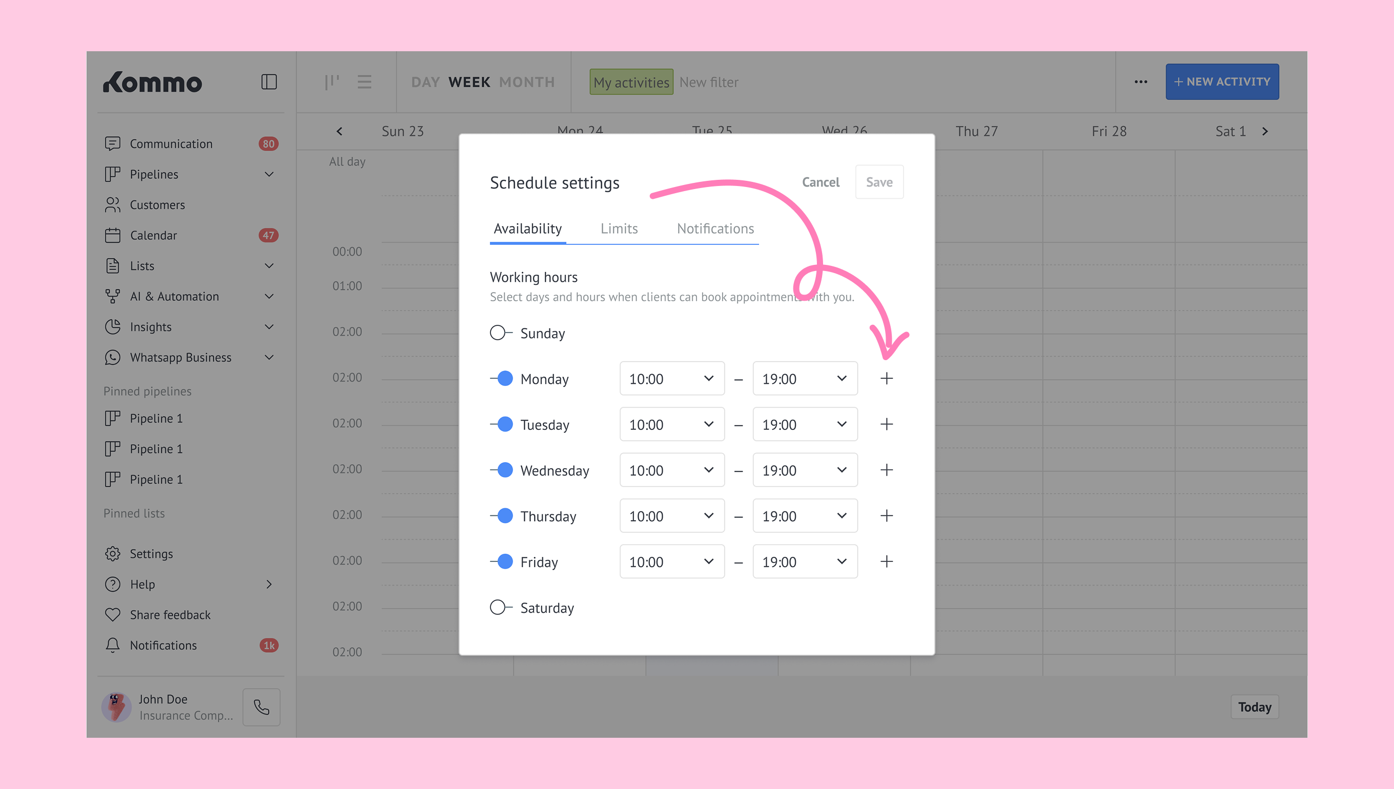 Schedule in Kommo defines your availability by letting you set working hours and block unavailable times, so appointments can’t be booked during those periods.