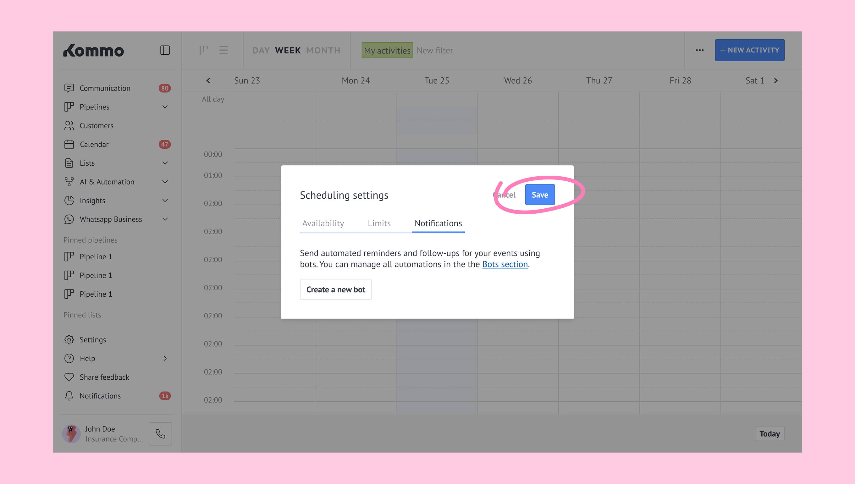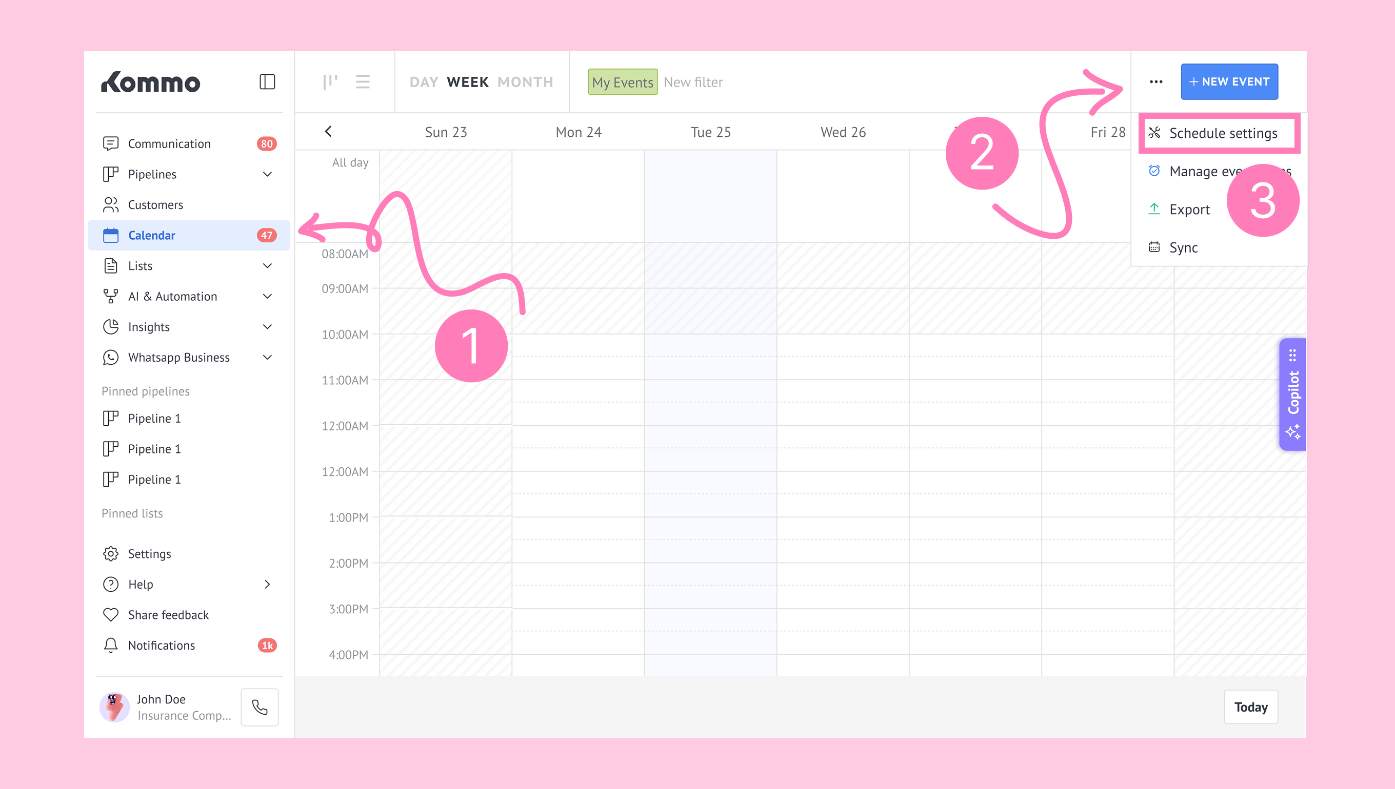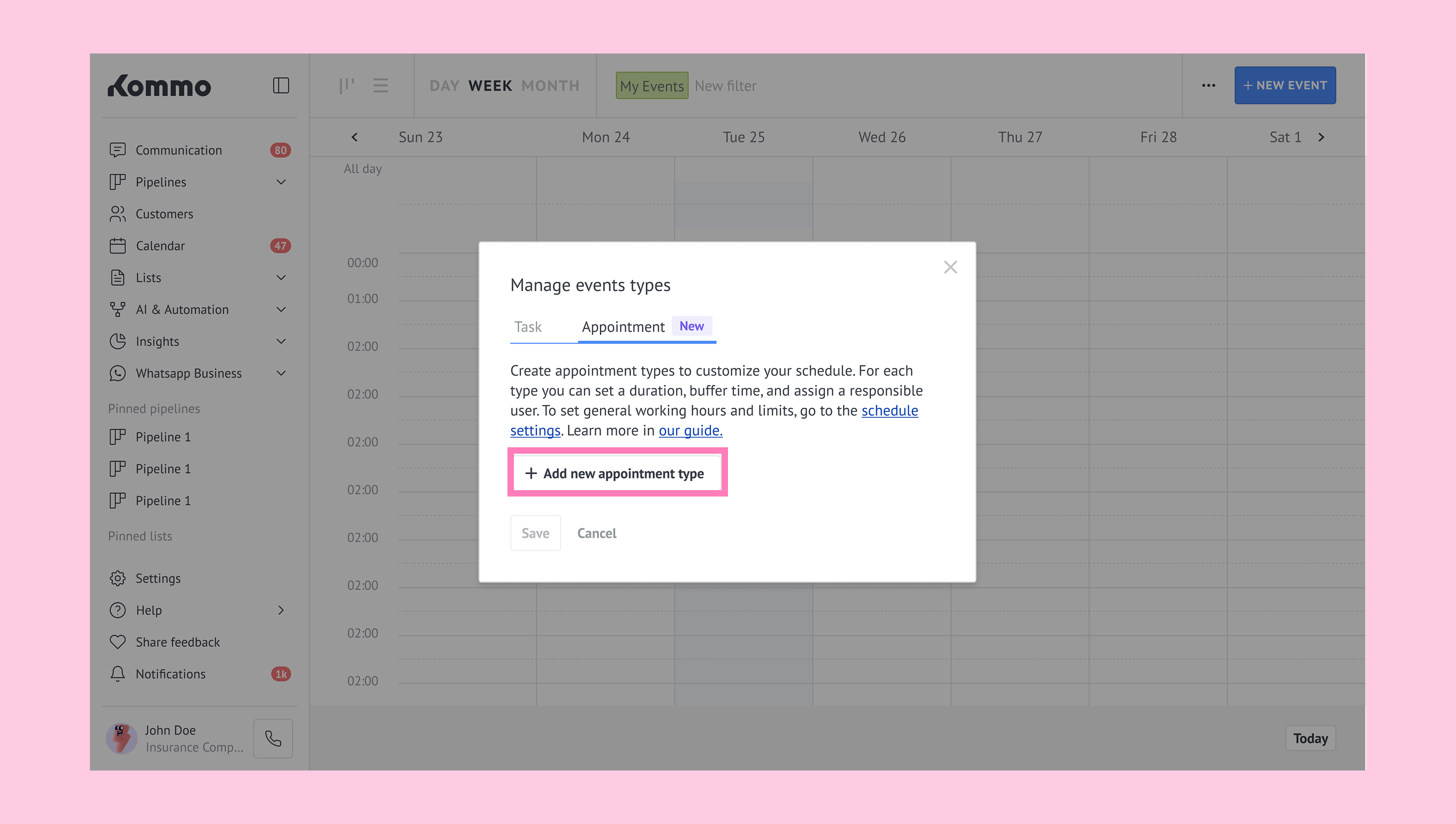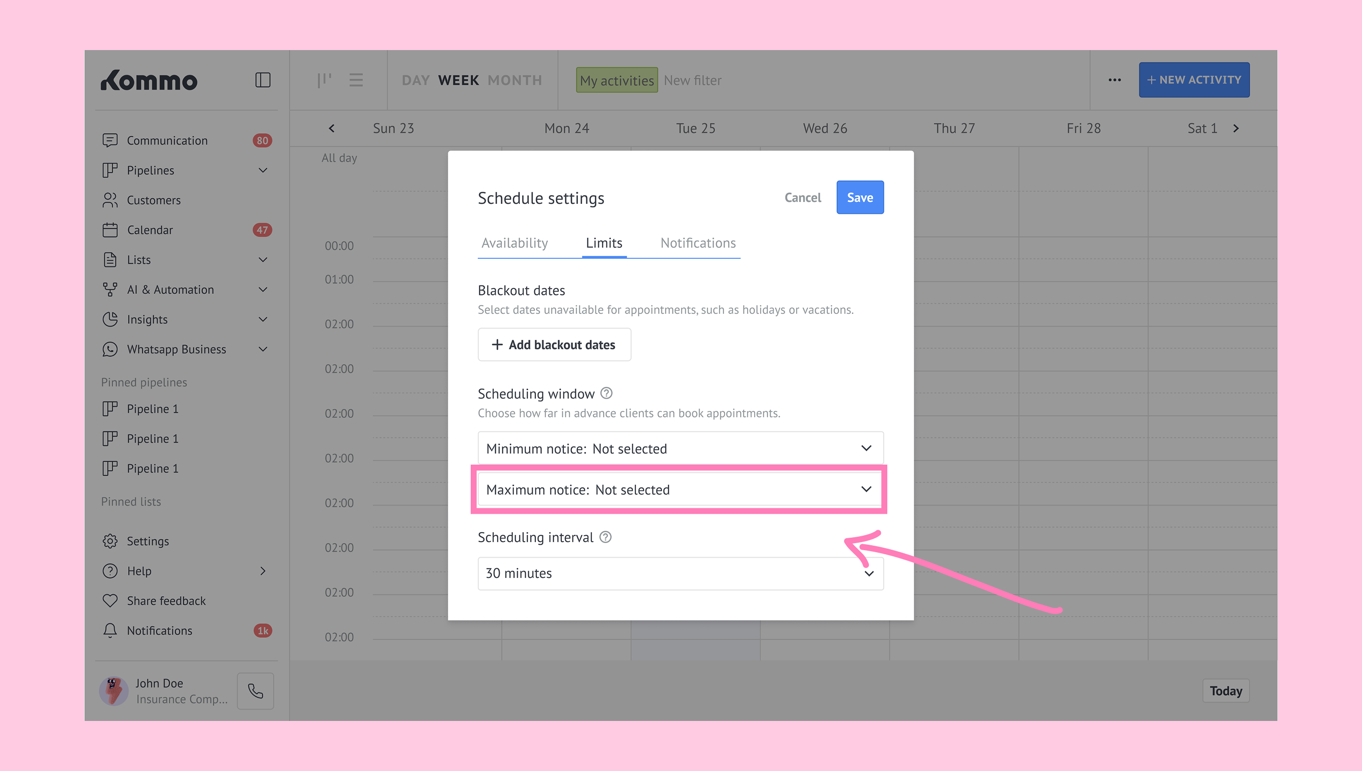 Schedule in Kommo defines your availability by letting you set working hours and block unavailable times, so appointments can’t be booked during those periods.