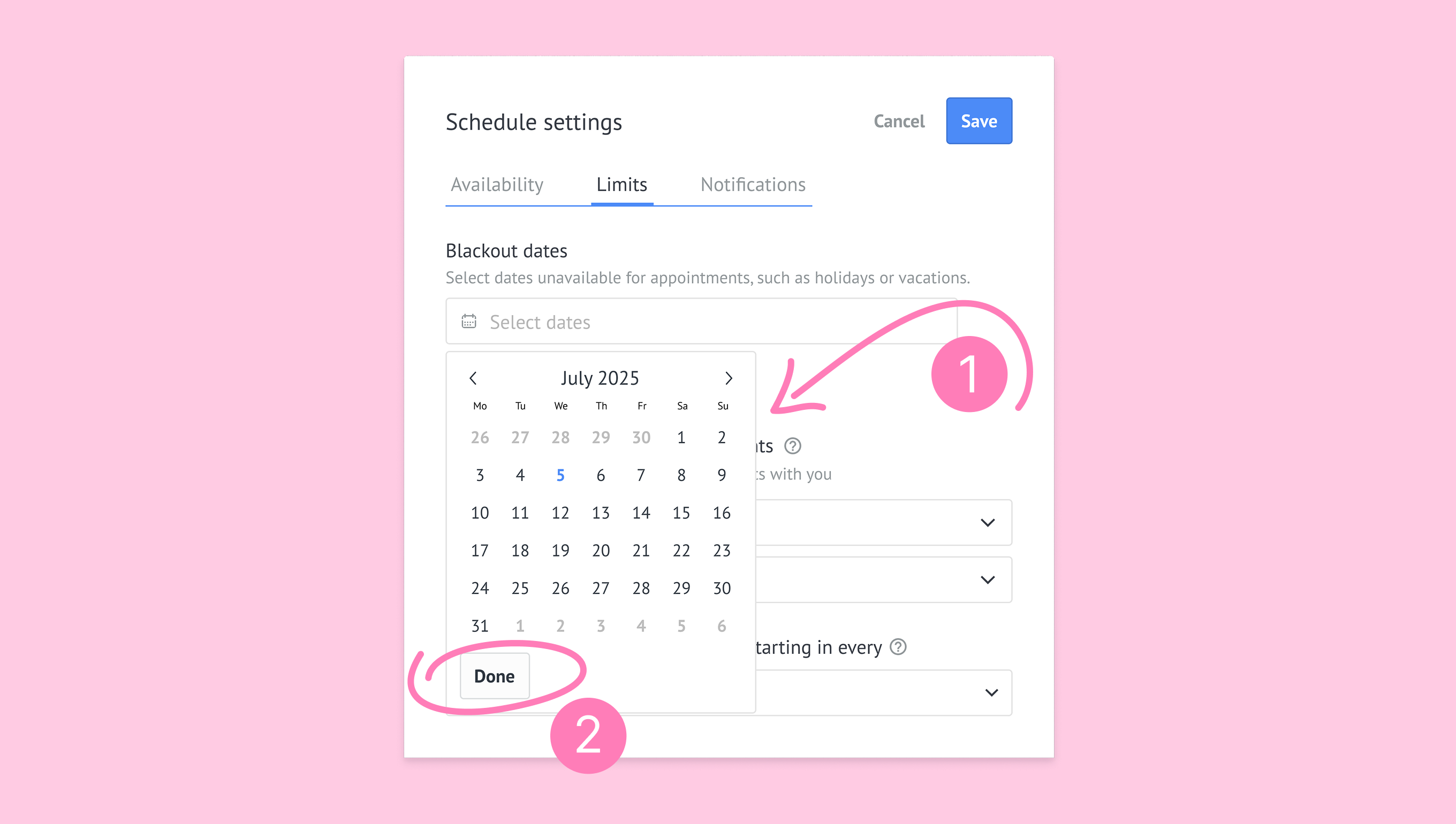 Go to Schedule settings → Blackout dates. Click + Add blackout dates.