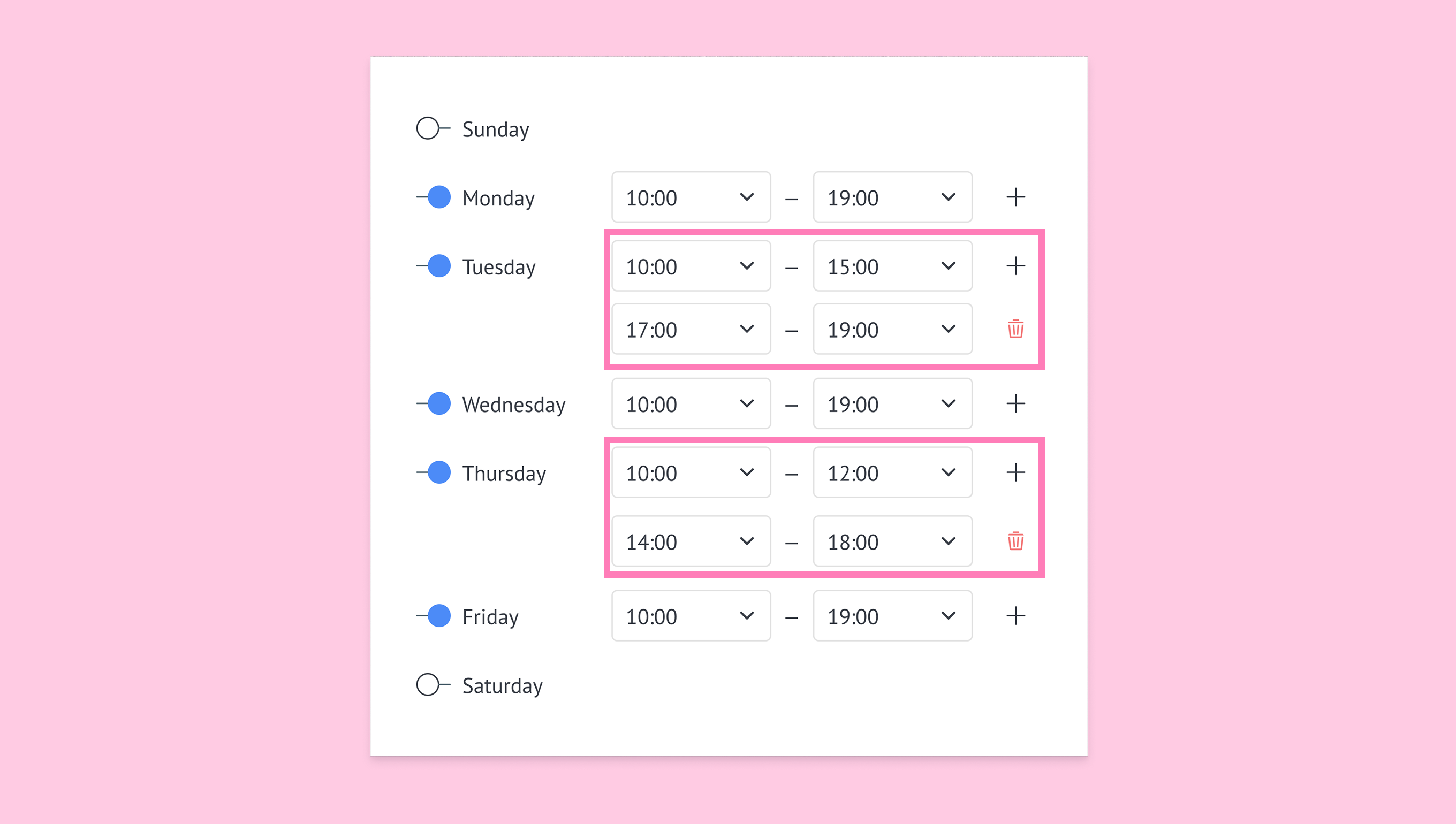 This can be done for each day of the week. For example: Tuesday: 10:00–15:00, 17:00–19:00; Friday: 12:00–14:00, 18:00–22:00.