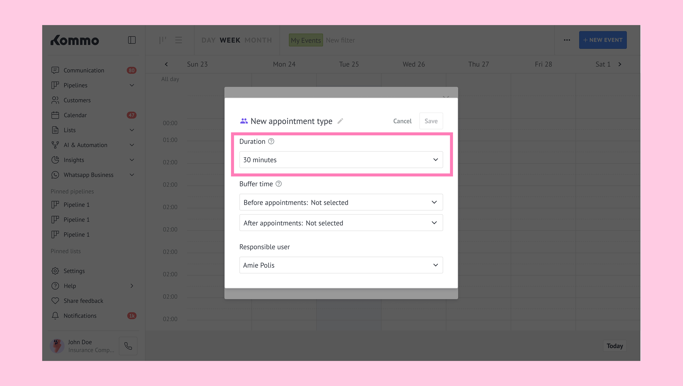 You can create appointment types with their own duration, responsible user, and buffer time between appointments.