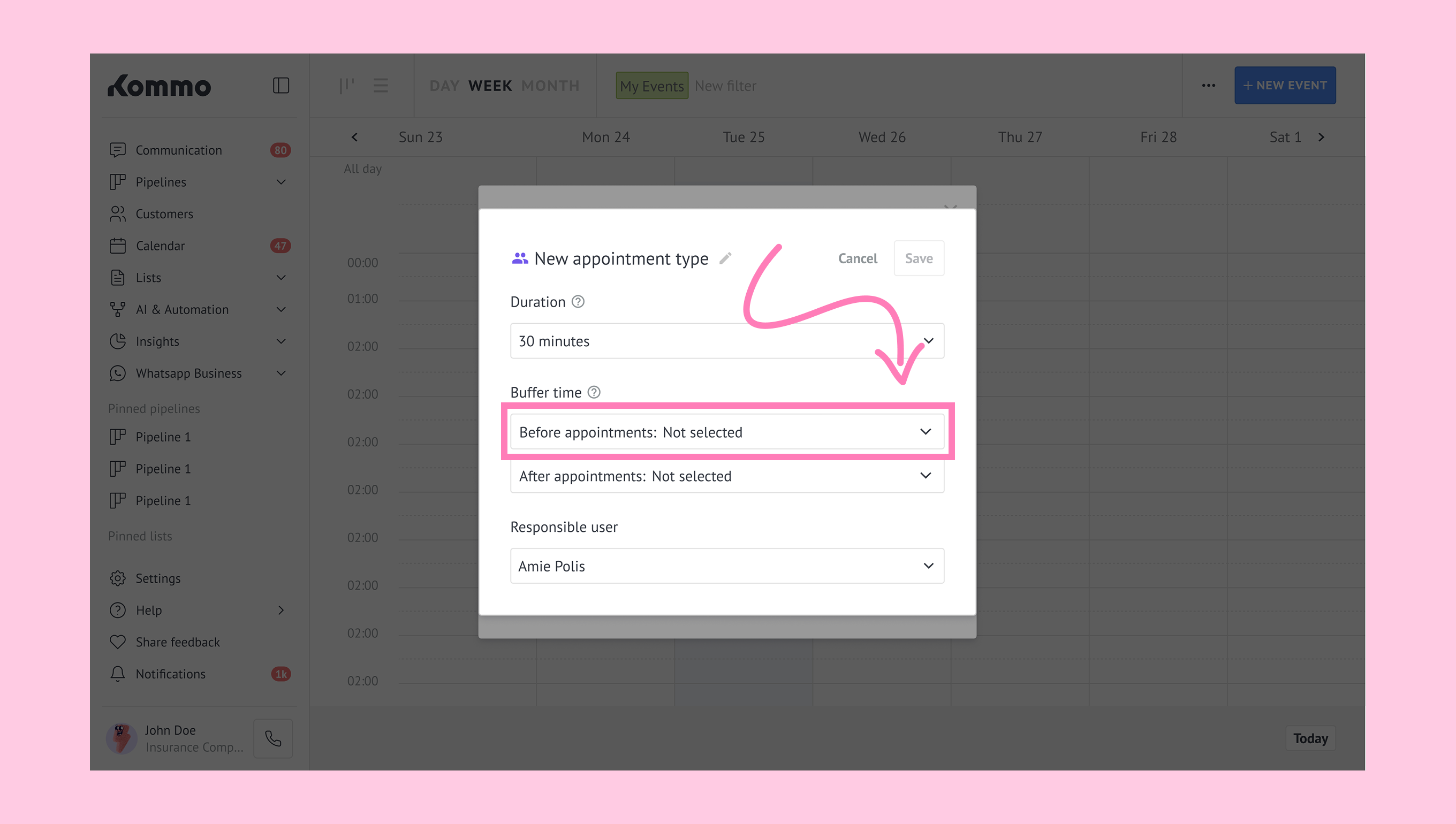 Click the Before appointments dropdown. → Select an option.