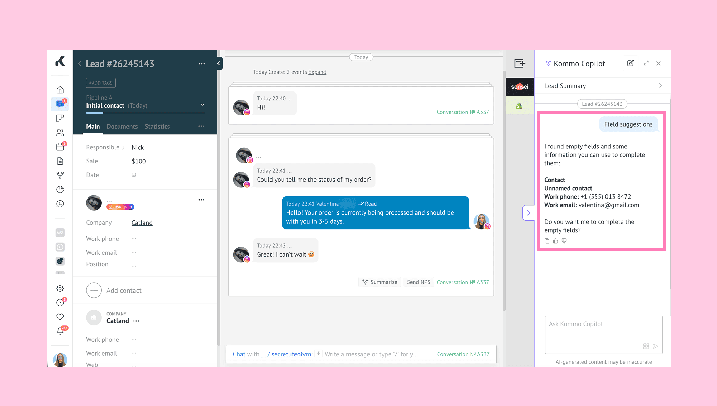 This guide explains how to use Kommo Copilot in conversations and lead cards.