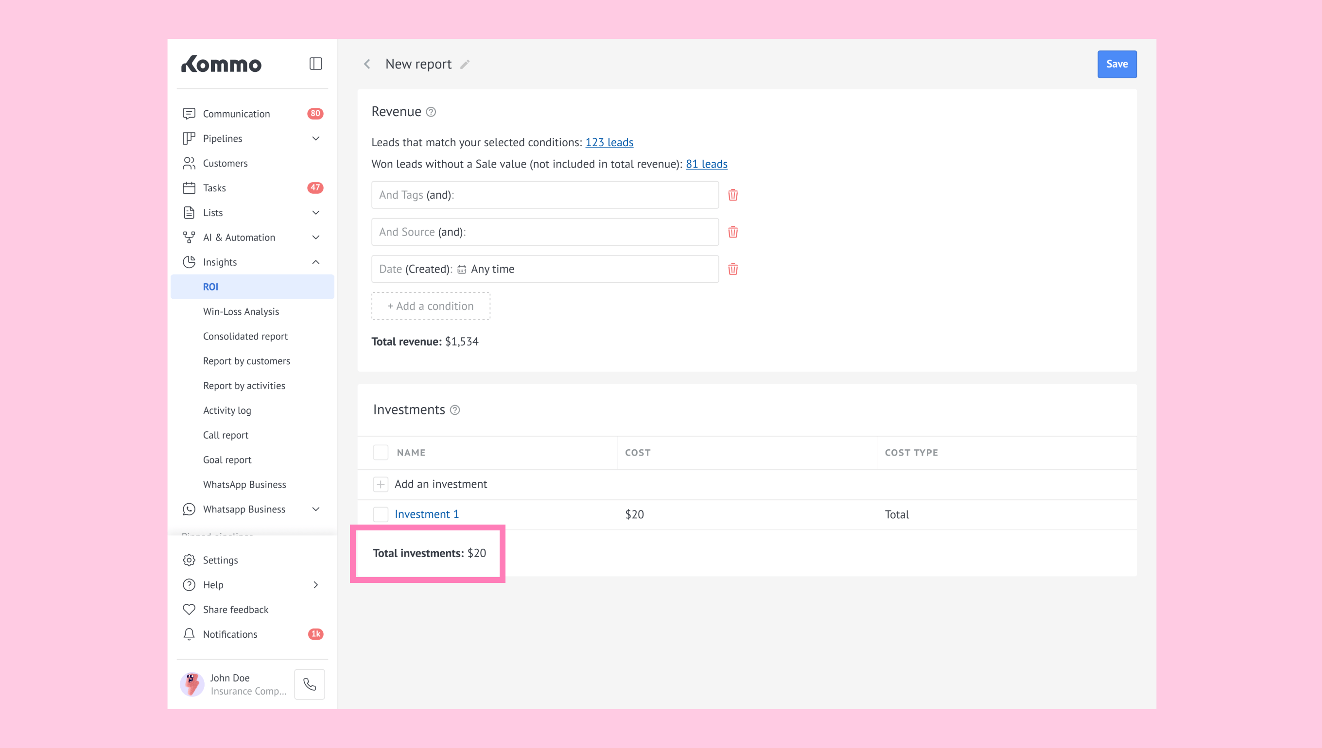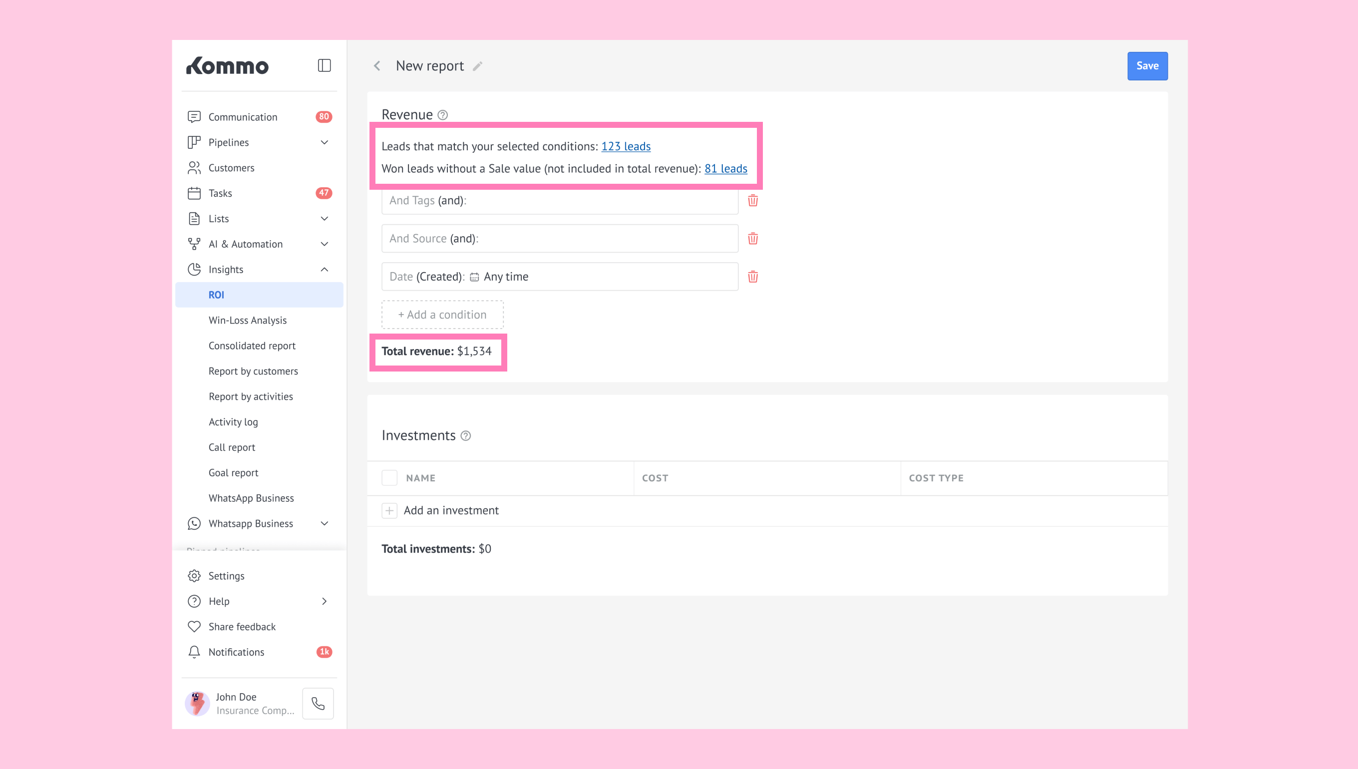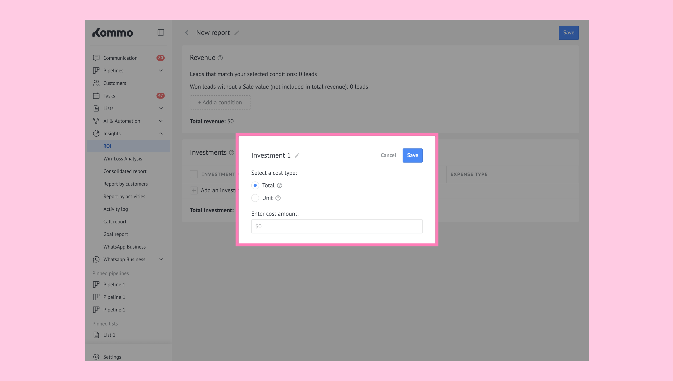 Unit: The cost per lead applied to your entire filtered sample. (For example: If your report includes 50 leads and you set Unit = $5, Kommo multiplies 50 × 5 = $250.)