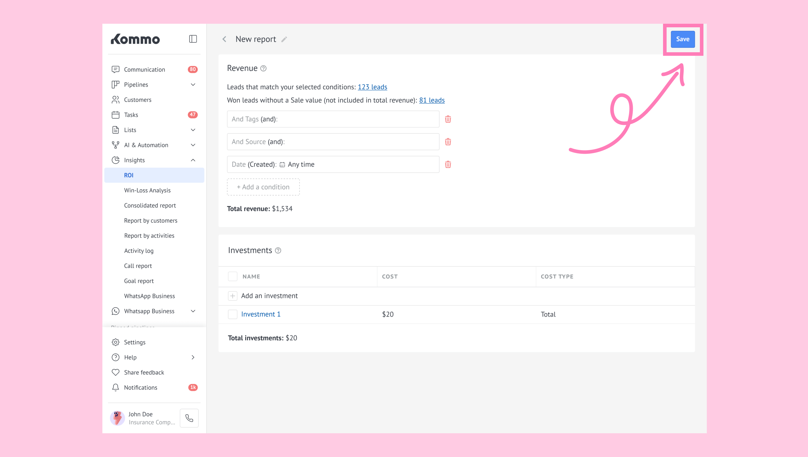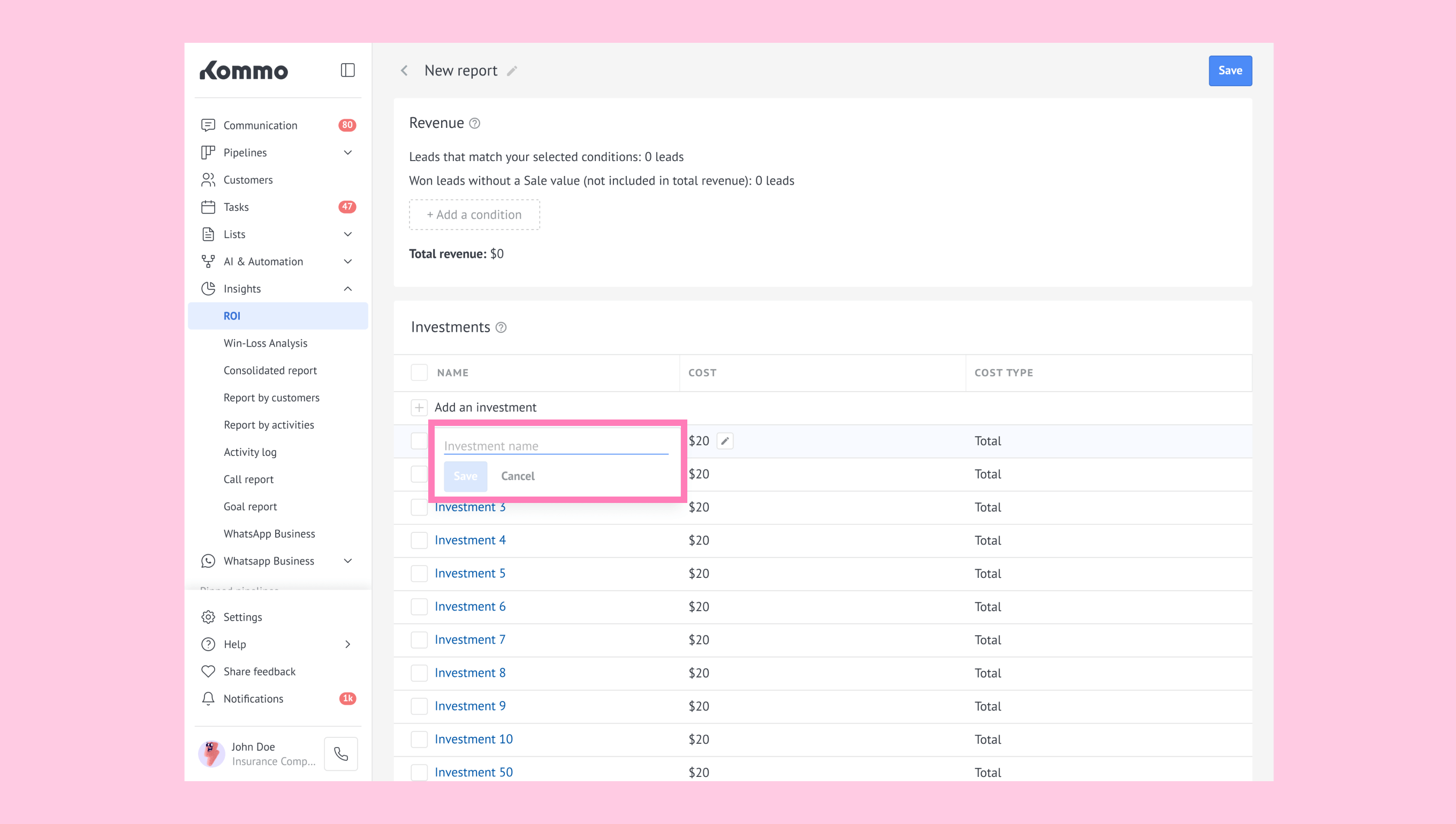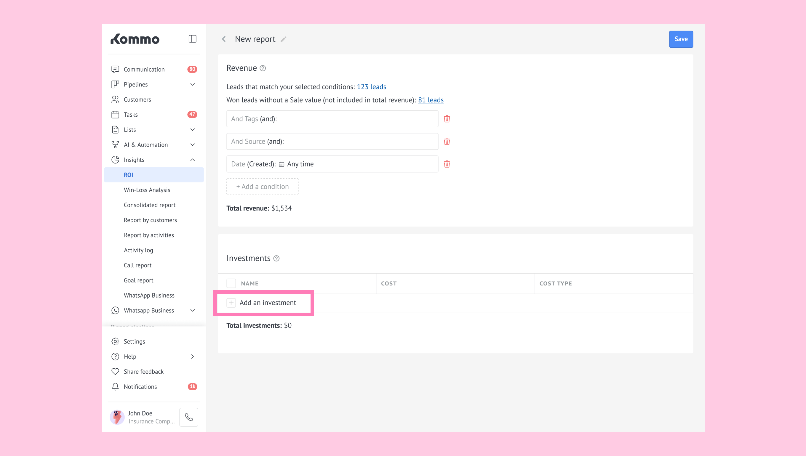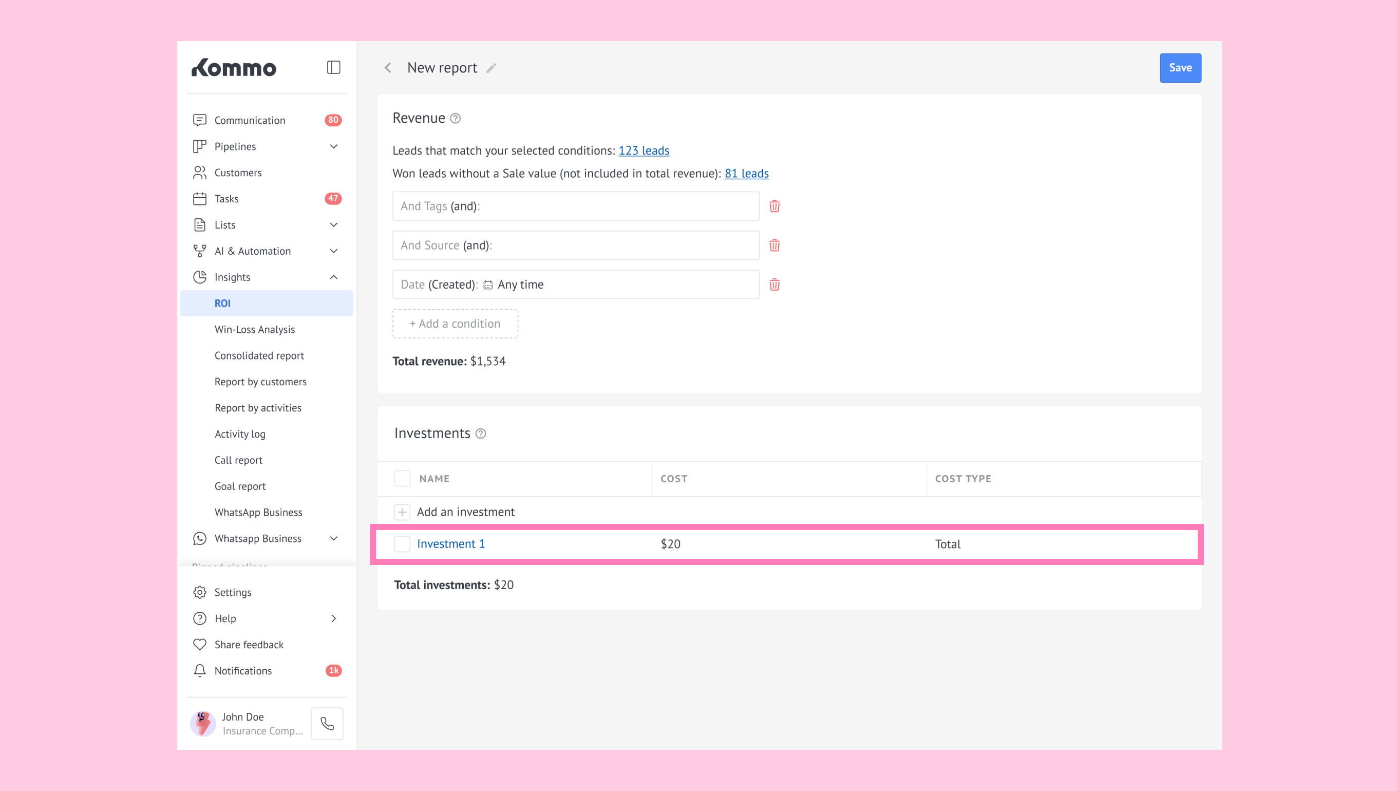 Unit: The cost per lead applied to your entire filtered sample. (For example: If your report includes 50 leads and you set Unit = $5, Kommo multiplies 50 × 5 = $250.)