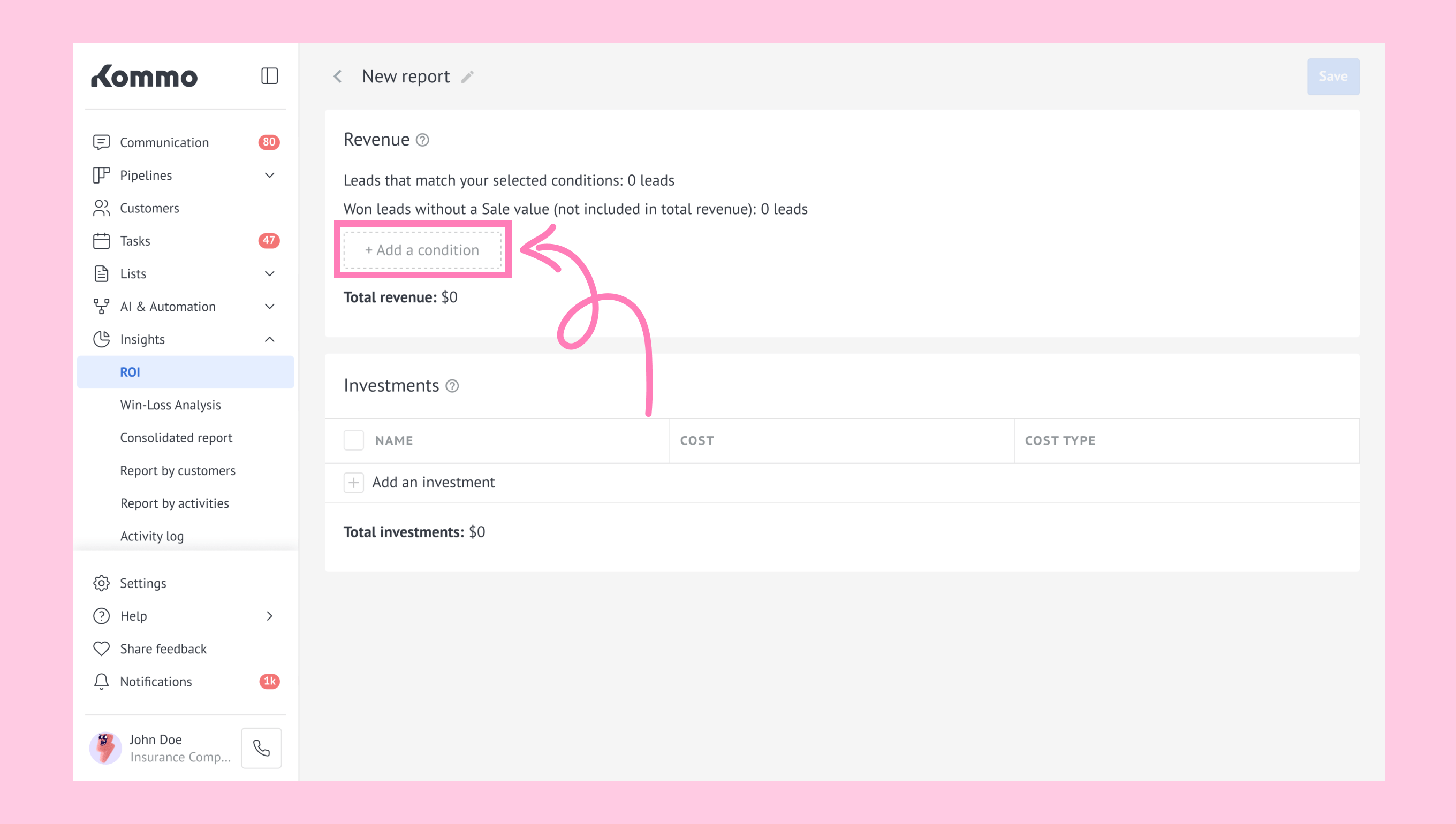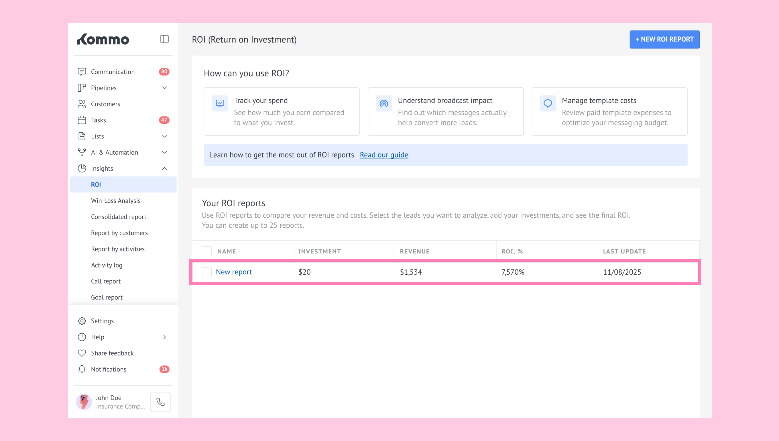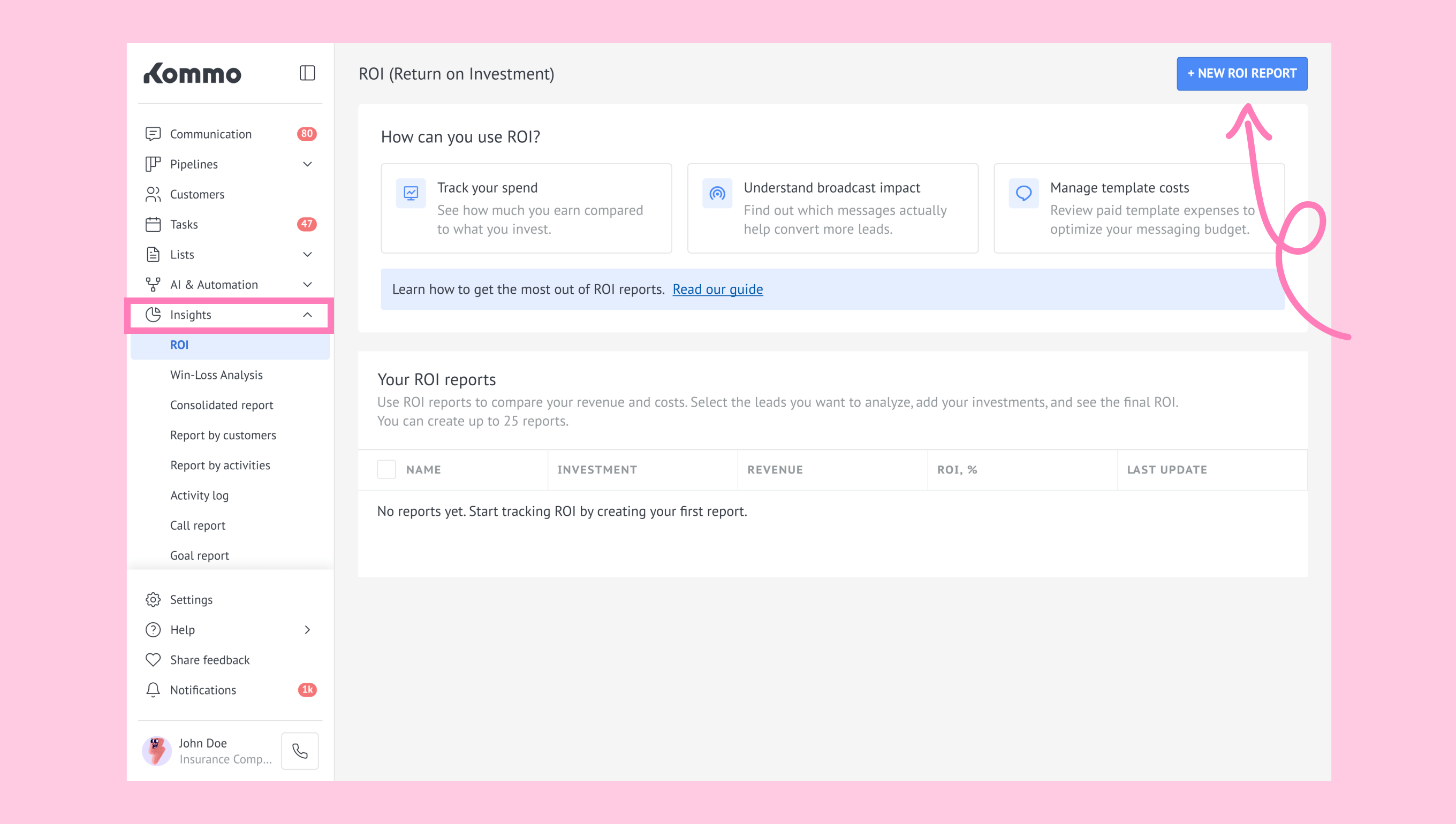 1. Go to Insights → ROI and click + NEW REPORT.