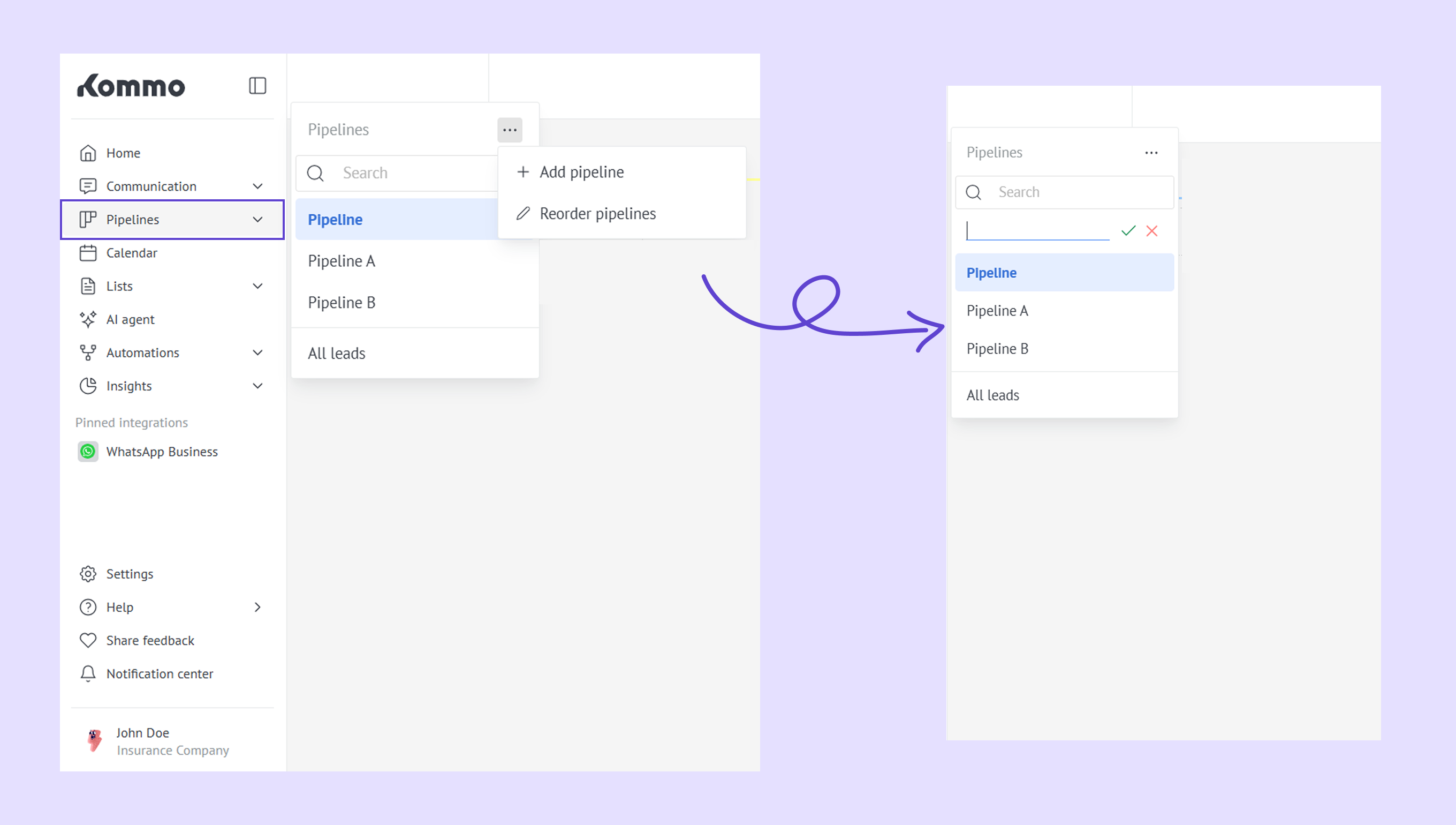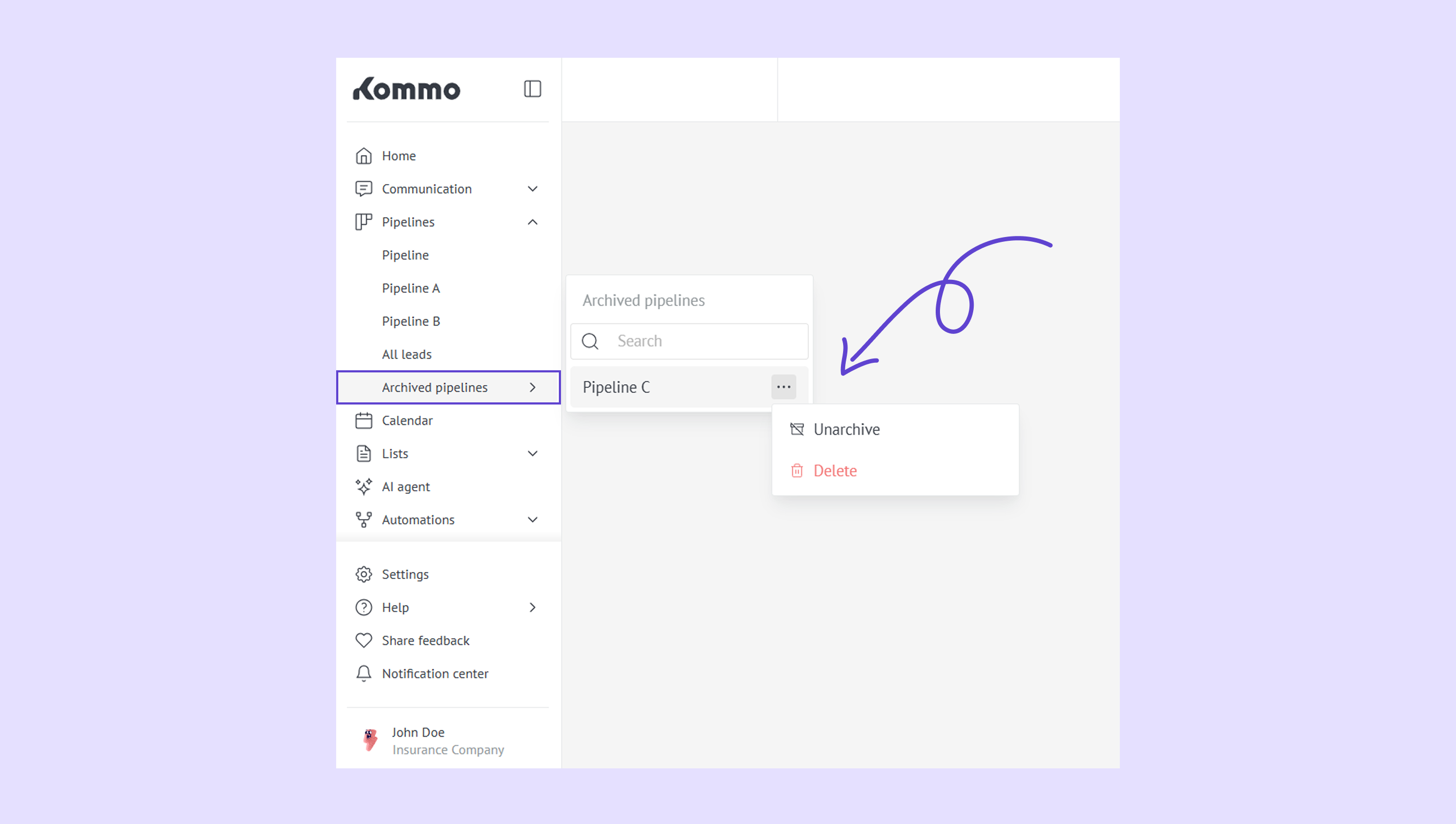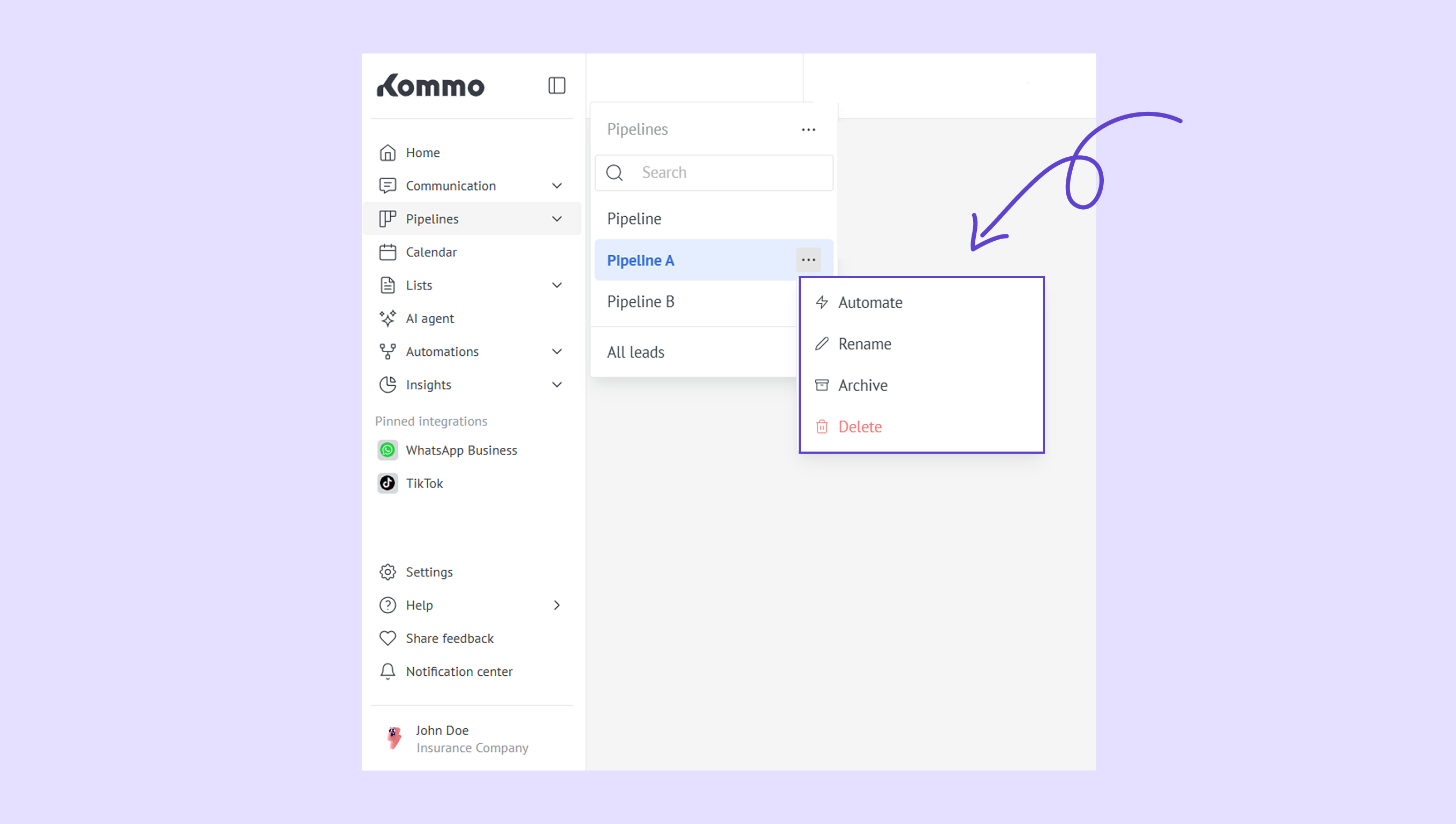 Manage pipelines – hover over a pipeline name and open the … menu to automate, rename, archive, or delete it.