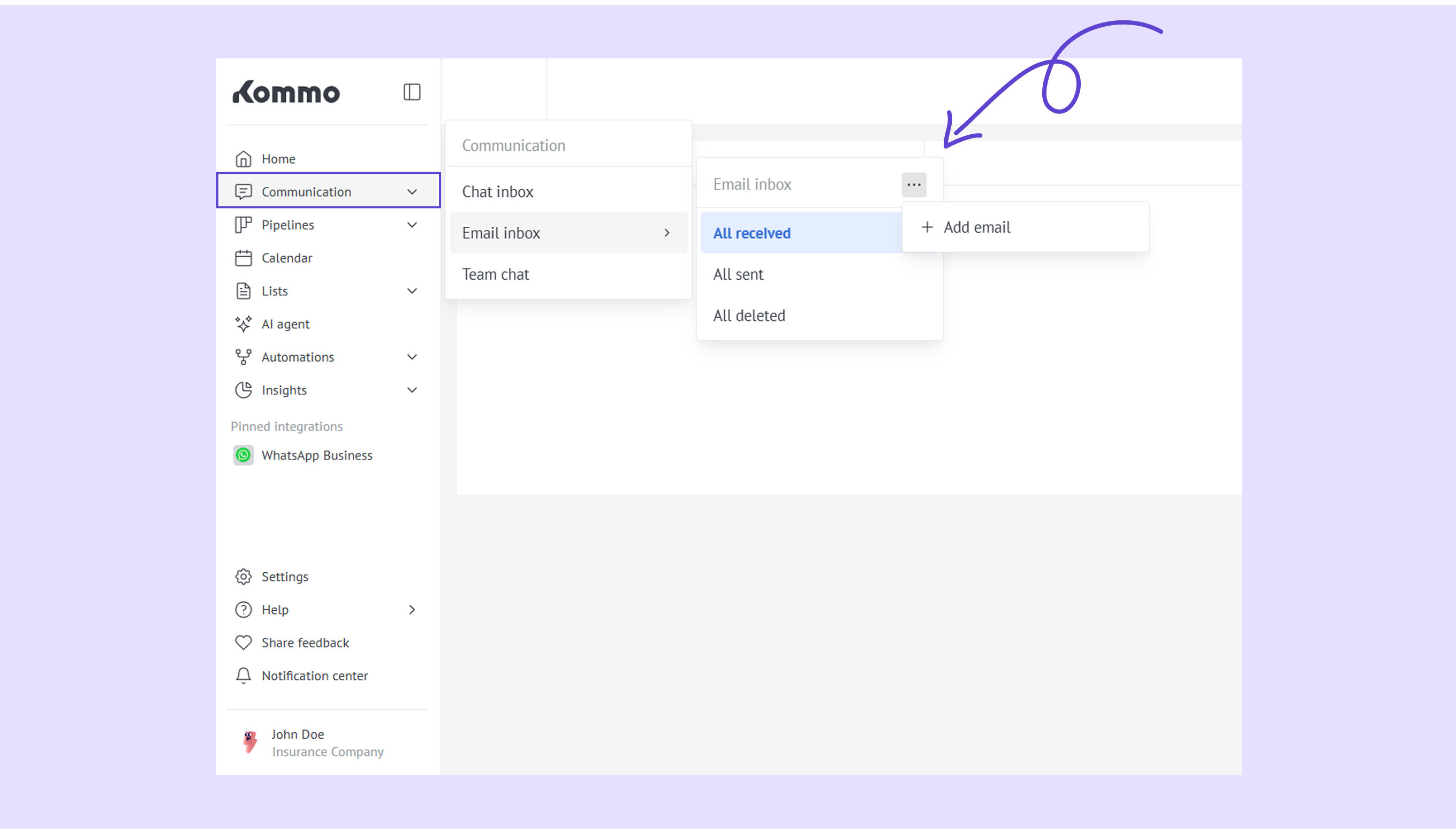 Email inbox – send, receive, and organize emails directly inside Kommo.