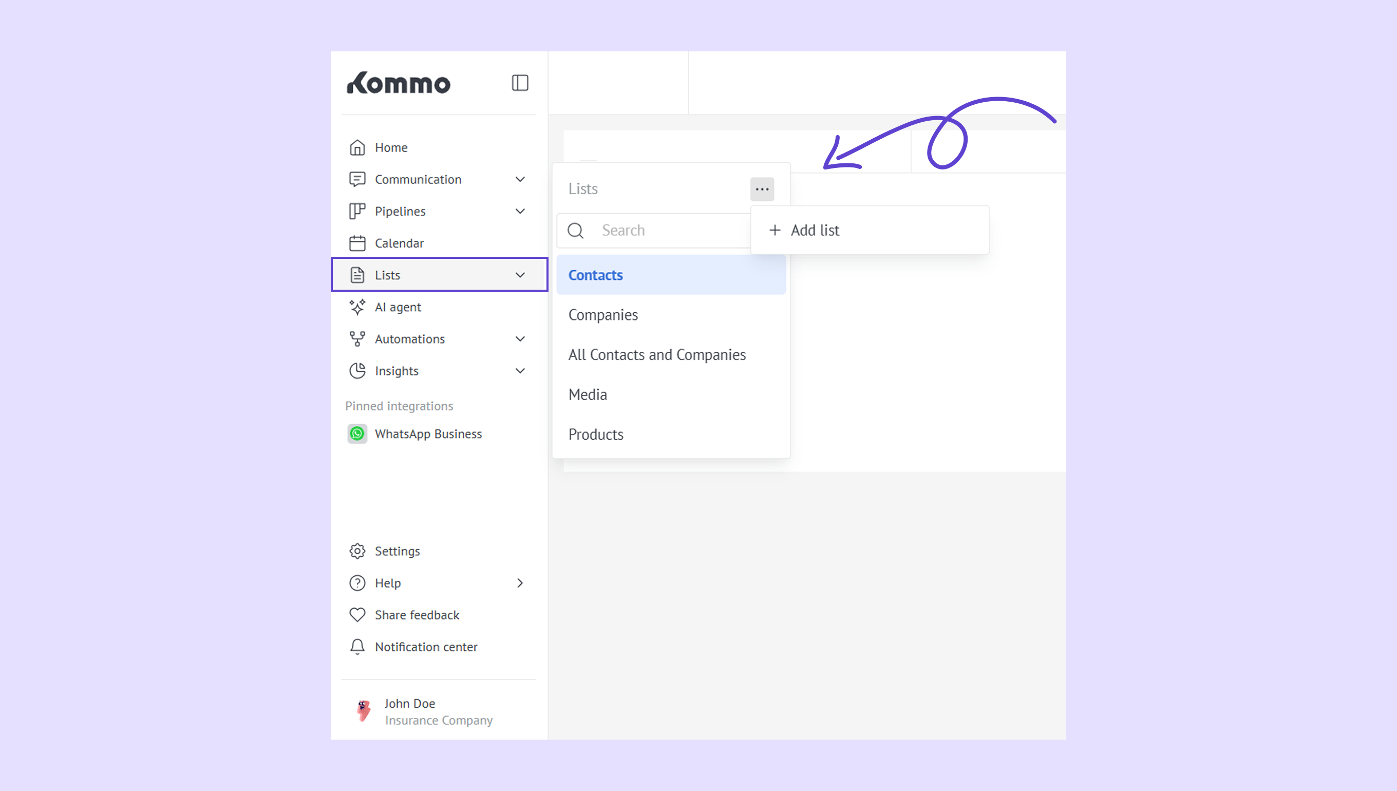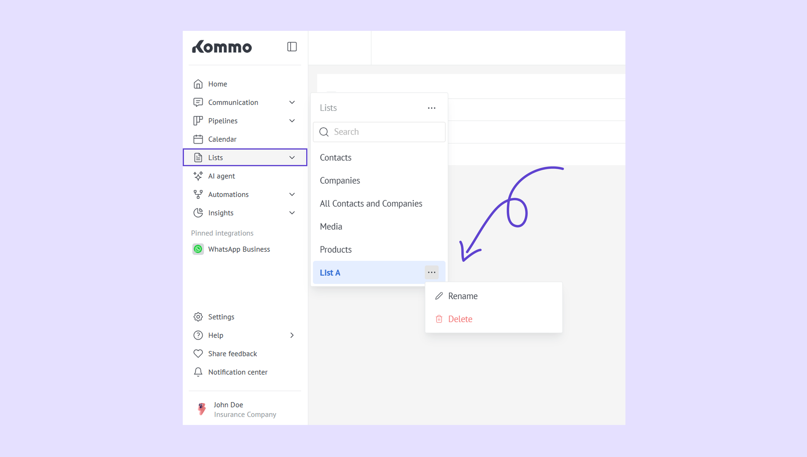 Rename or delete a list – hover over any list name and open the … menu. From there, you can update or remove it anytime.
