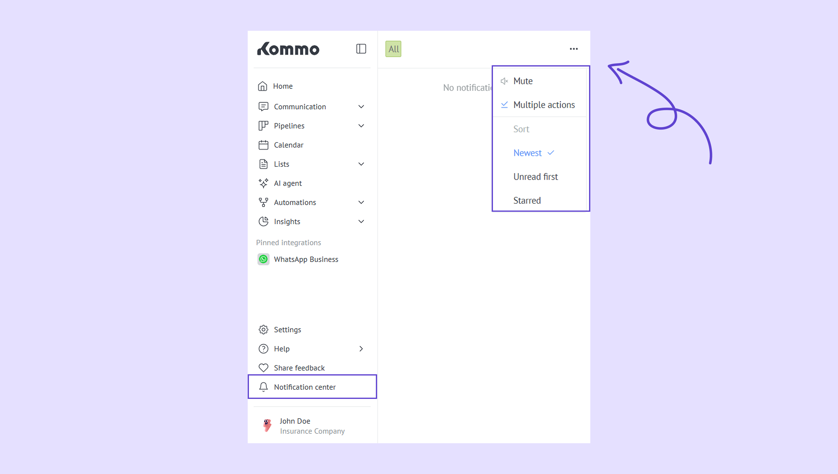 Broadcasting – send messages to many clients at once without leaving Kommo.