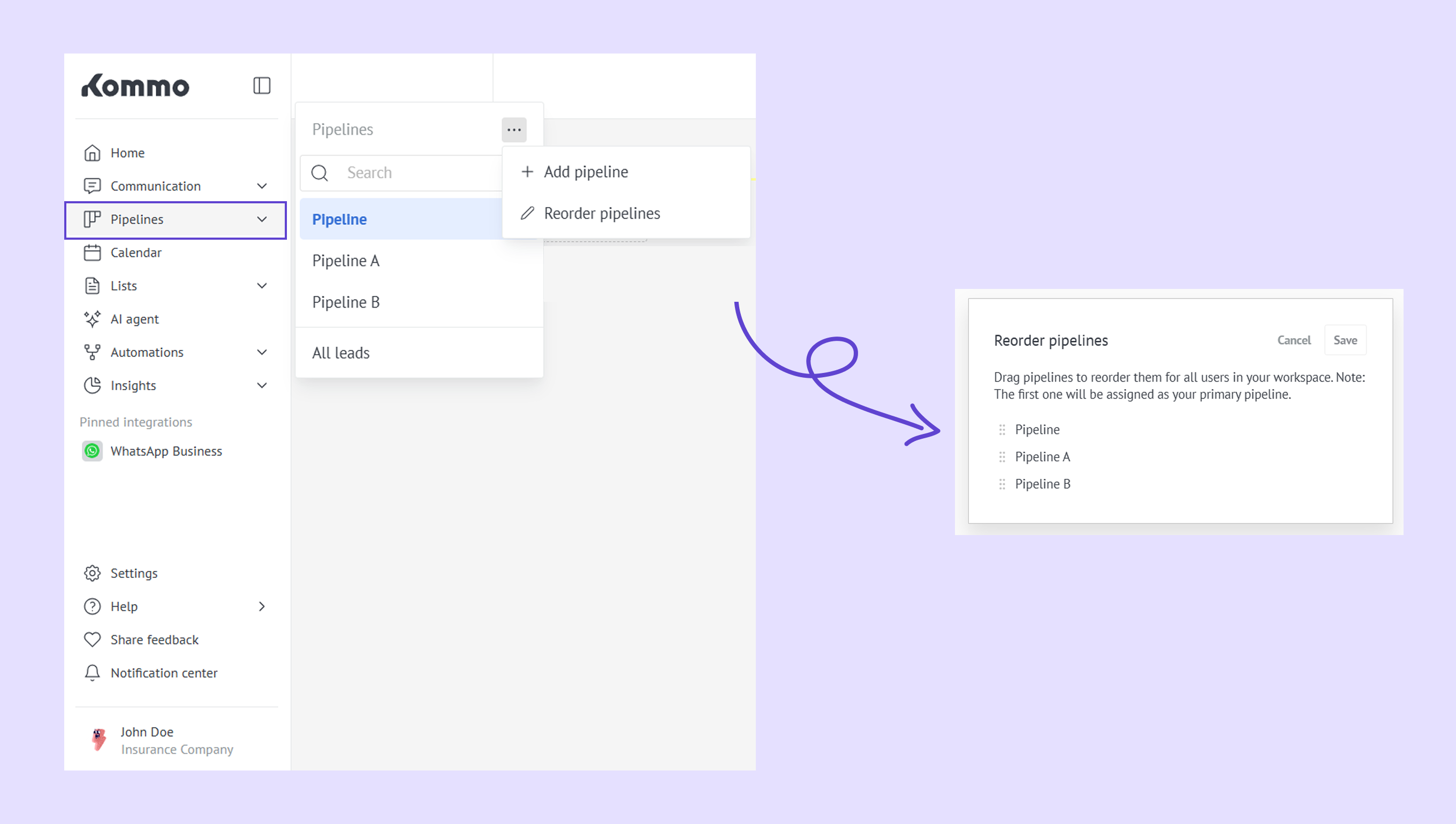 Reorder pipelines – choose Reorder pipelines in the … menu and drag them into the order that works best for you.