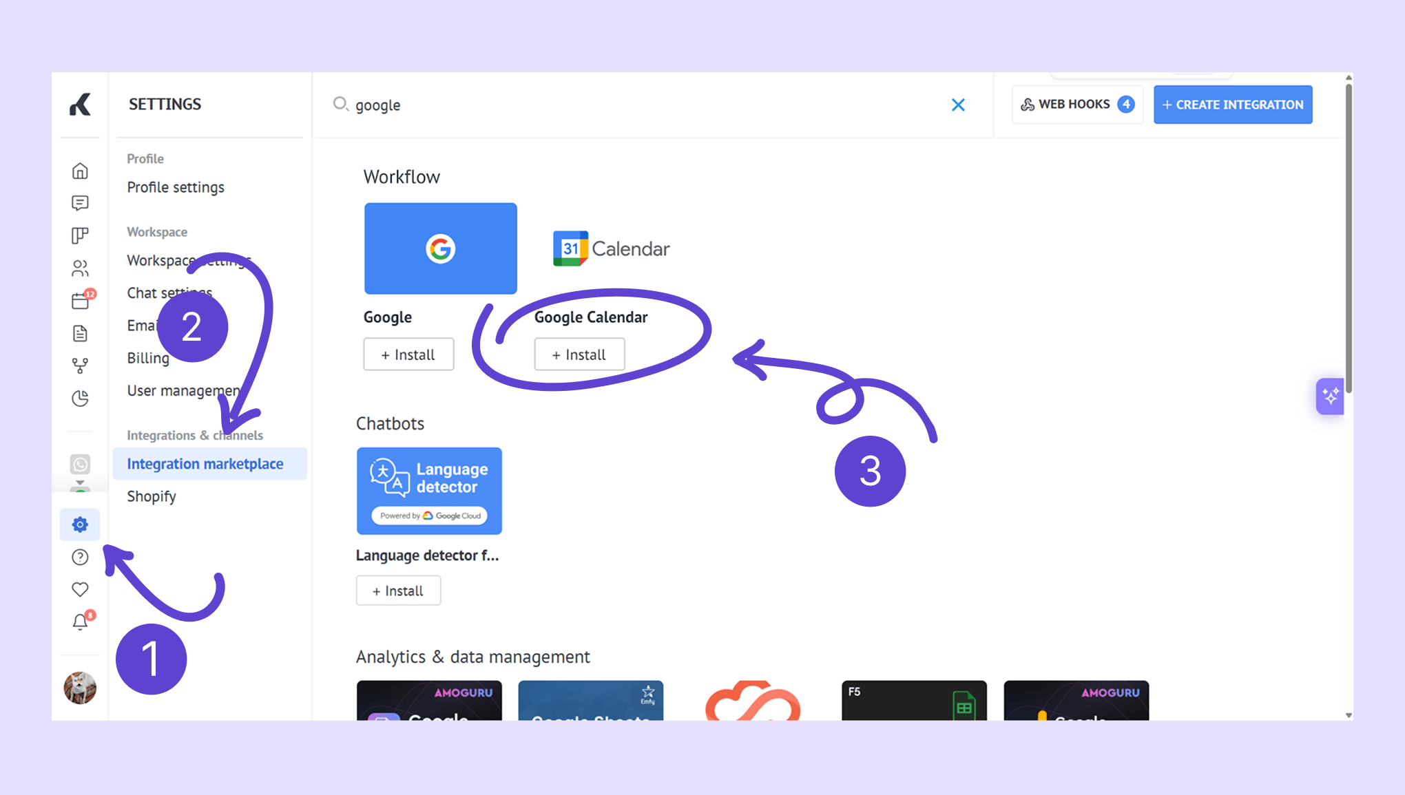 Go to Settings → Integration marketplace → search for Google Calendar . Click Install.