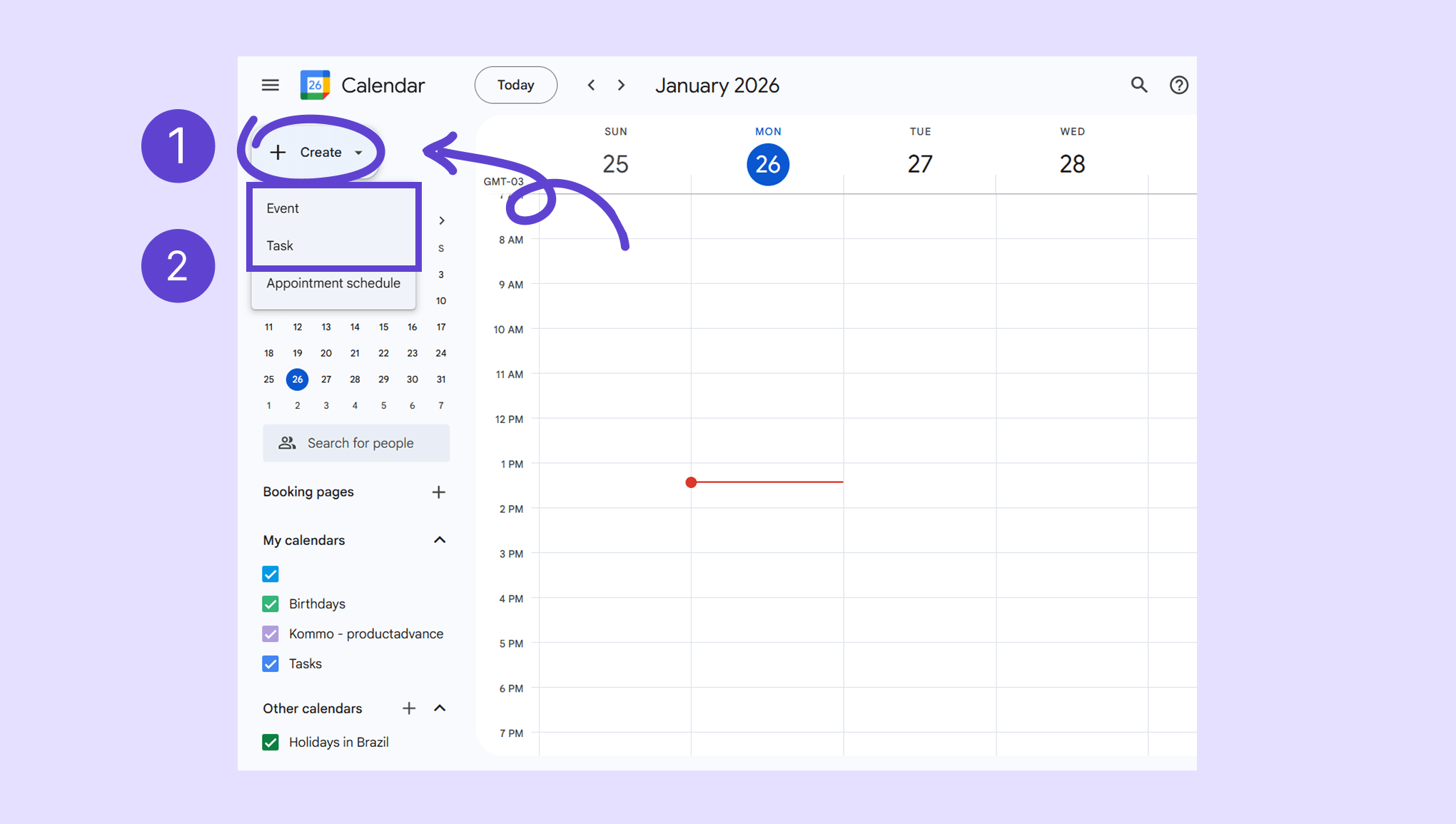 Go to Google Calendar → click Create . Create an event or task.