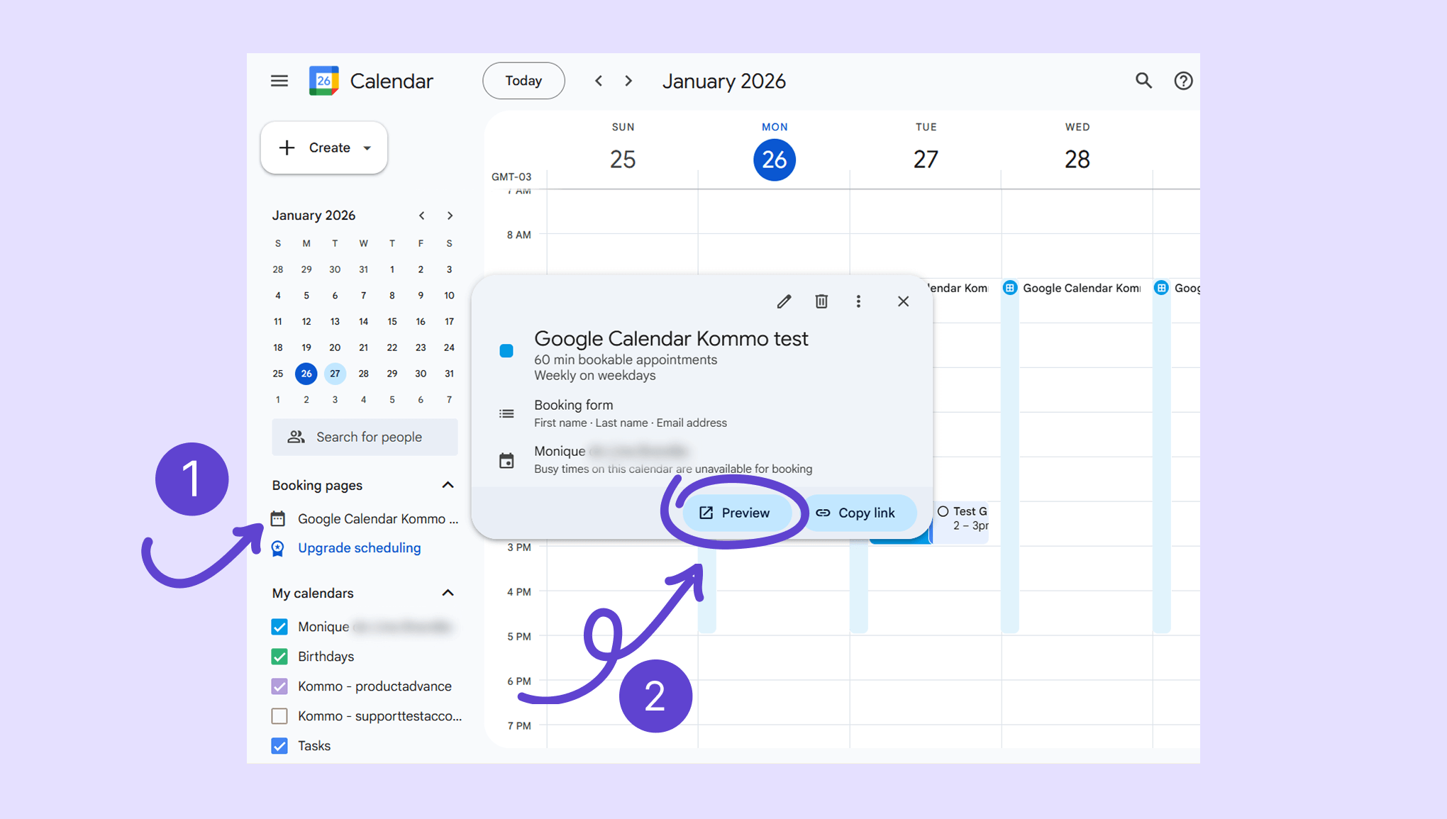 Go to the Booking pages section, click on your schedule → click Preview .