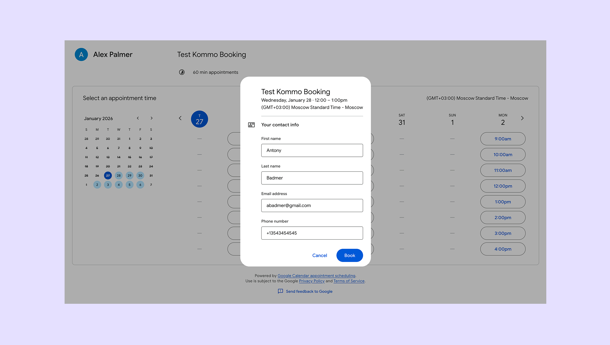 Select a timeslot and book a test appointment (as if you were a lead).