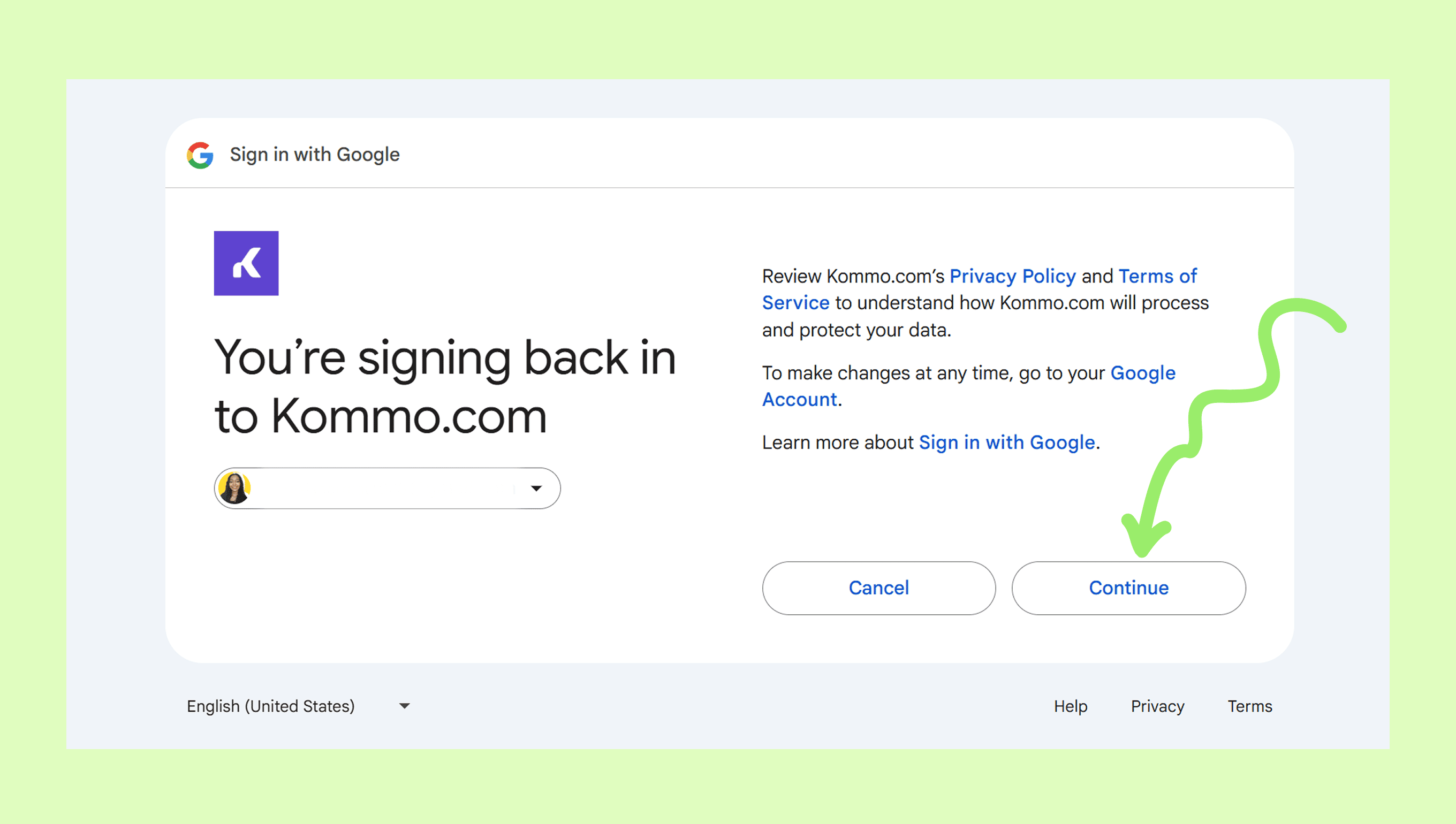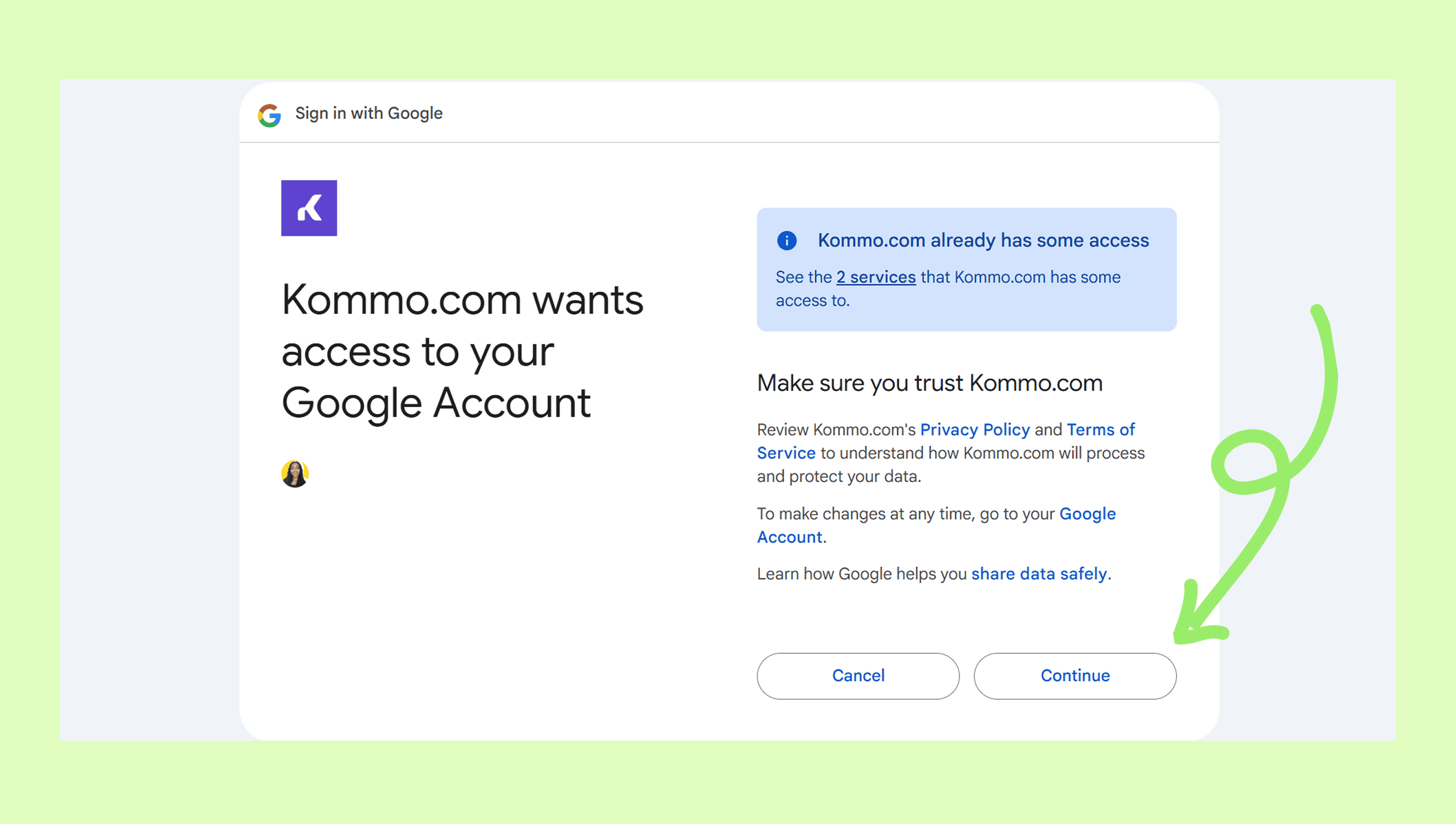 1. Grant Kommo the necessary permissions by selecting the required checkbox, then click Continue.