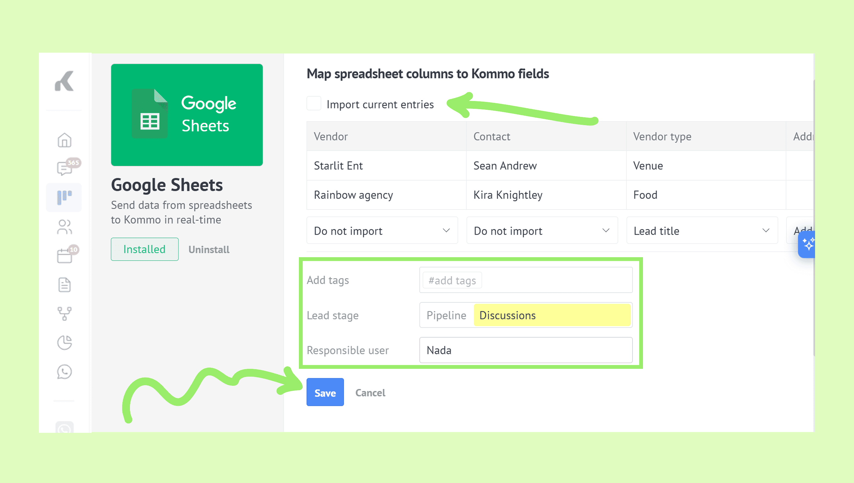 • Add tags: Automatically assign tags to new leads created from the spreadsheet. This helps categorize and filter leads more efficiently in Kommo.