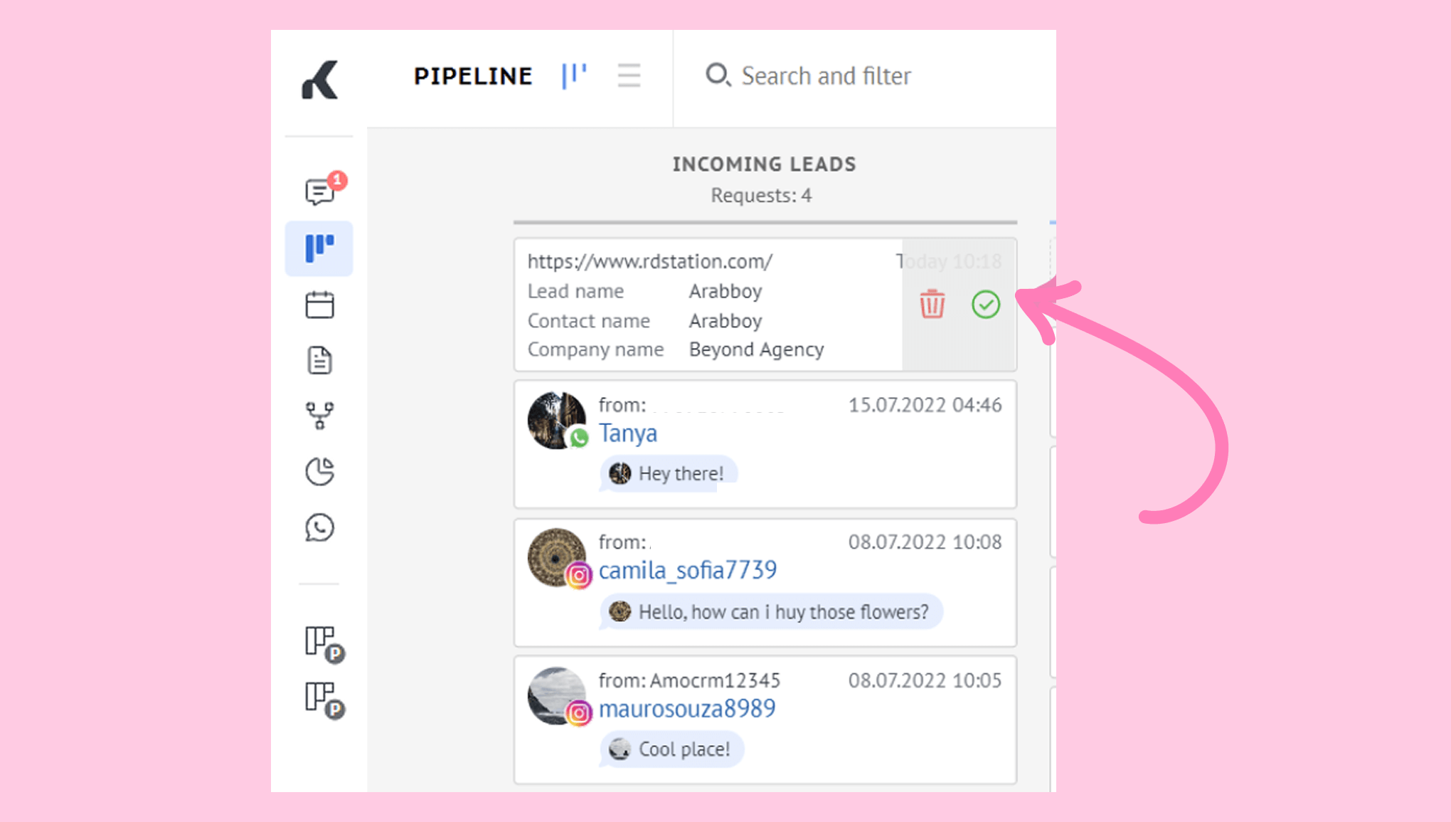 • A Lead is created in RD Station and an Incoming Lead appears in Kommo.