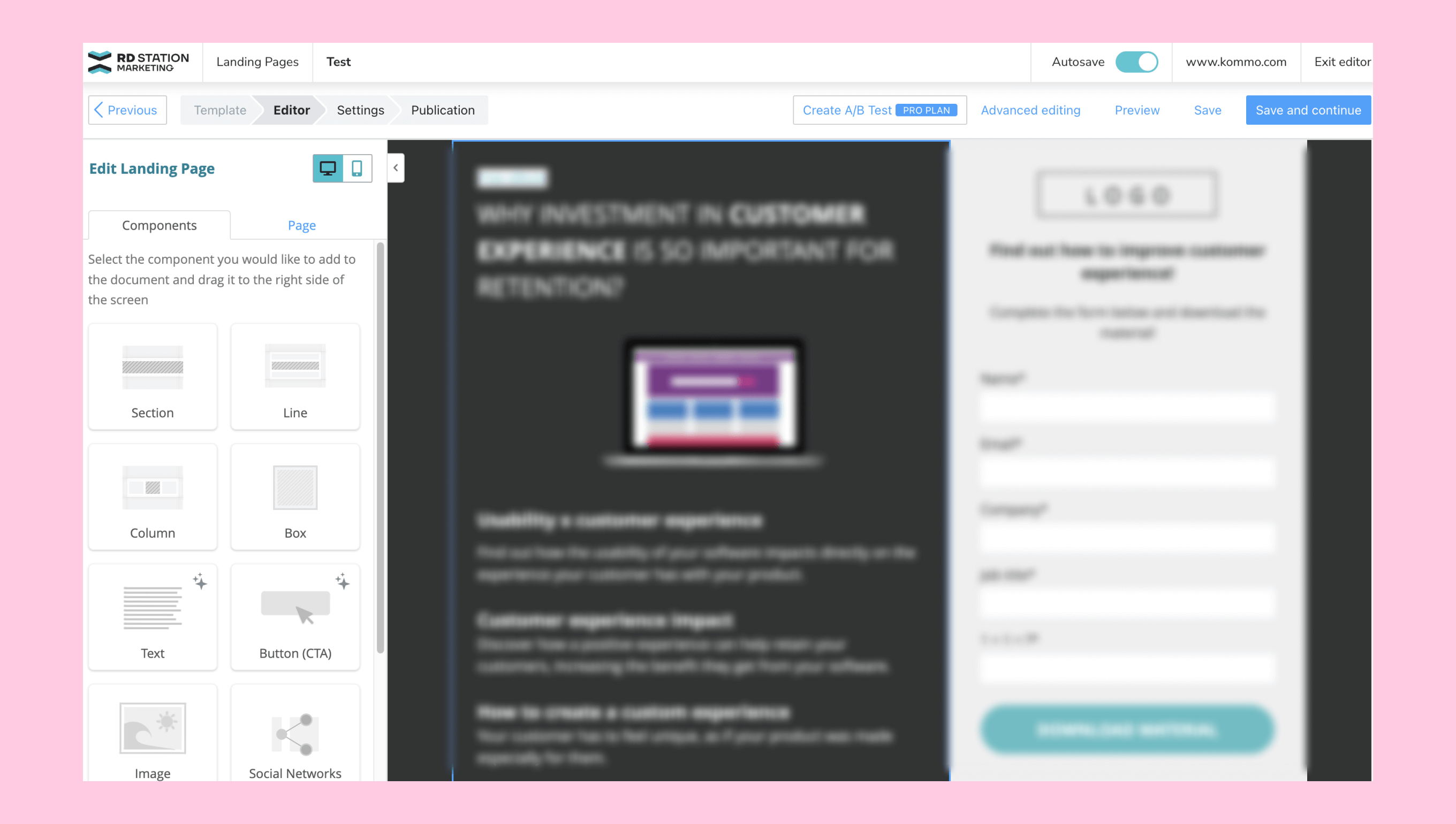 1. In the editor, update the text, add components from the left menu, and click Save and Continue when done.
