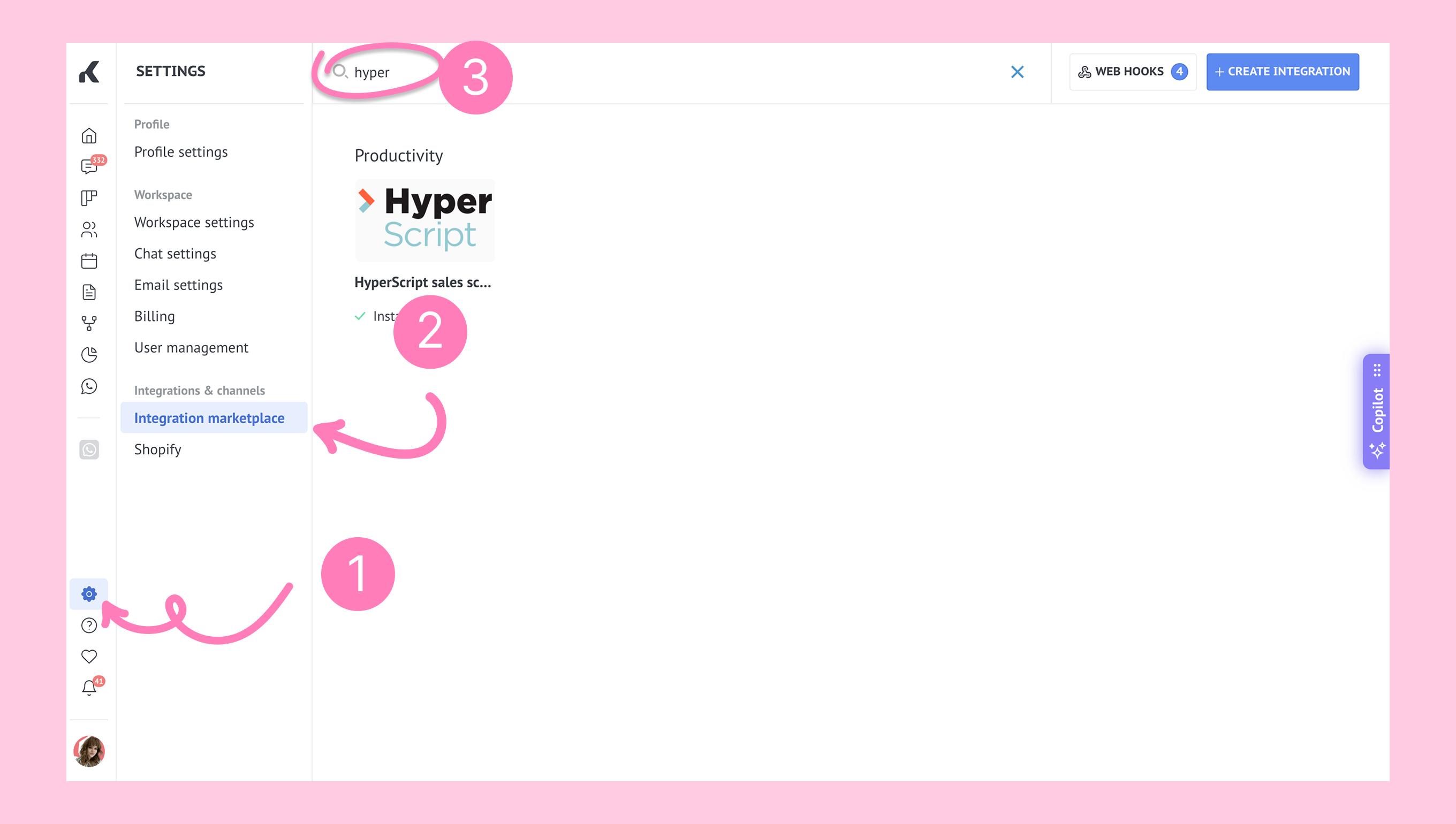 Open Kommo. Go to Settings → Integrations and search for the HyperScript integration.
