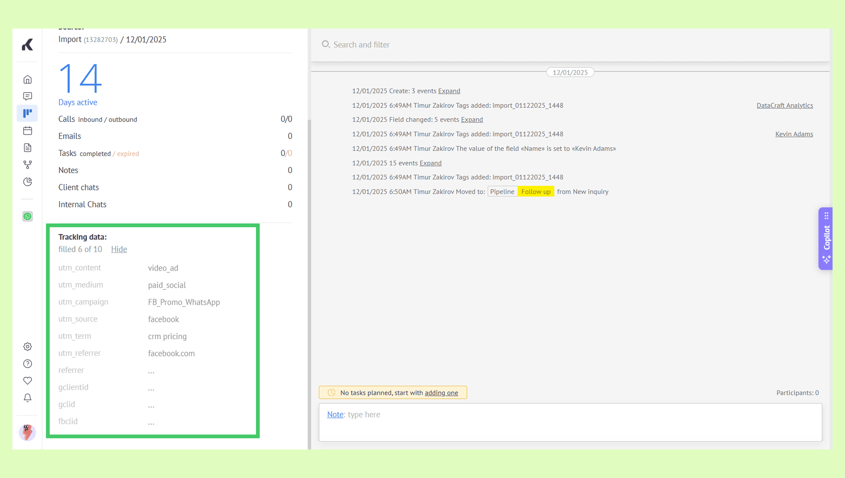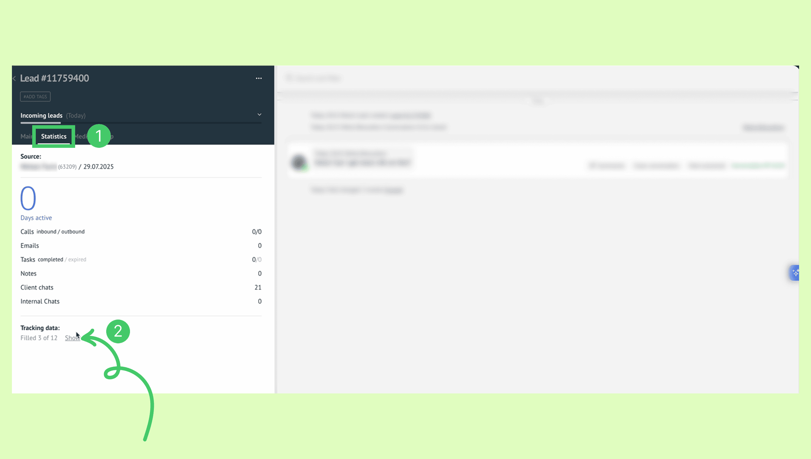 1. UTM values appear in the Statistics → Tracking data tab of the lead card. Click Show to see the UTM tags from the ad.