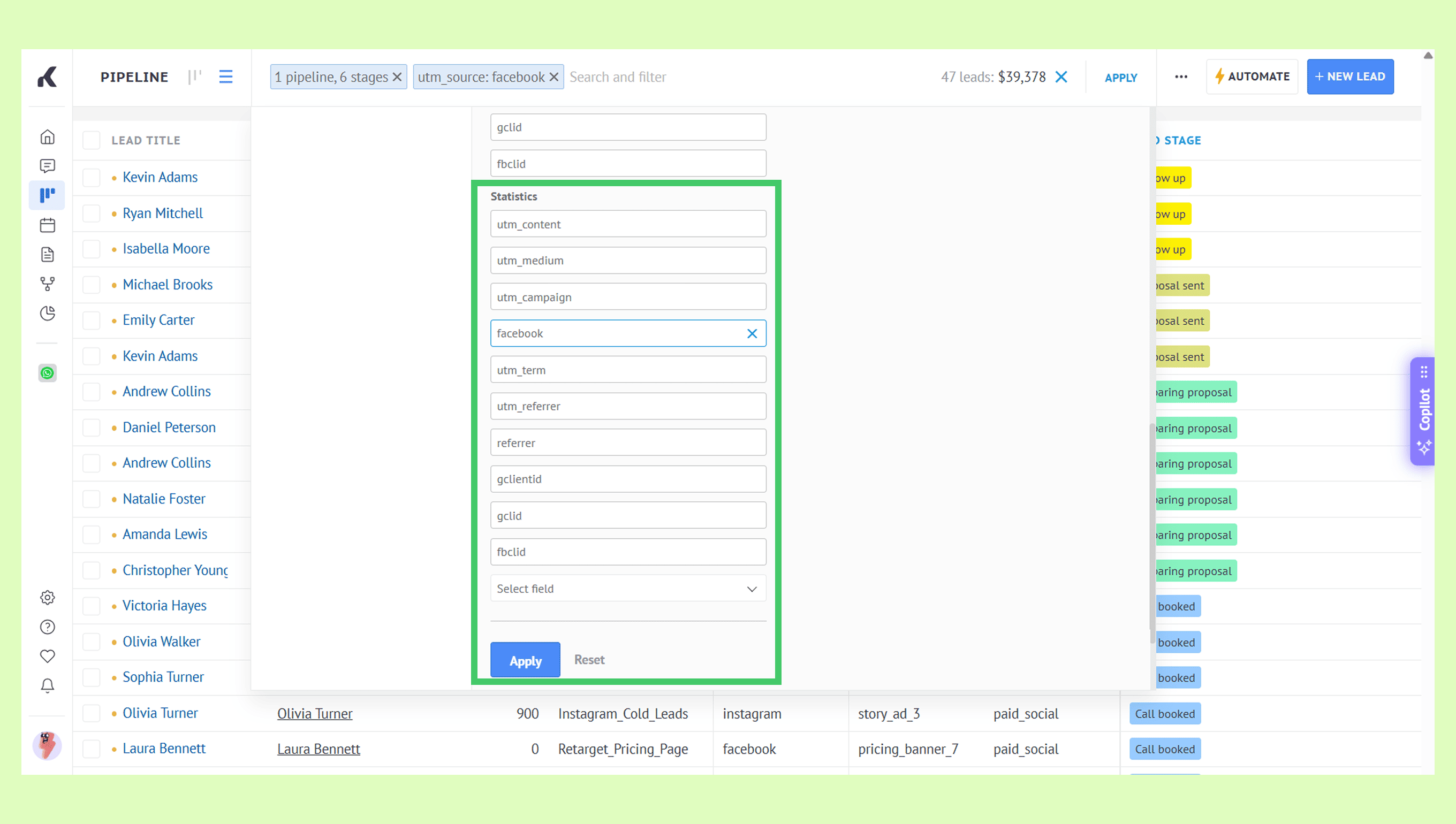 To evaluate performance, go to Leads → Search & filter and filter by UTM fields.