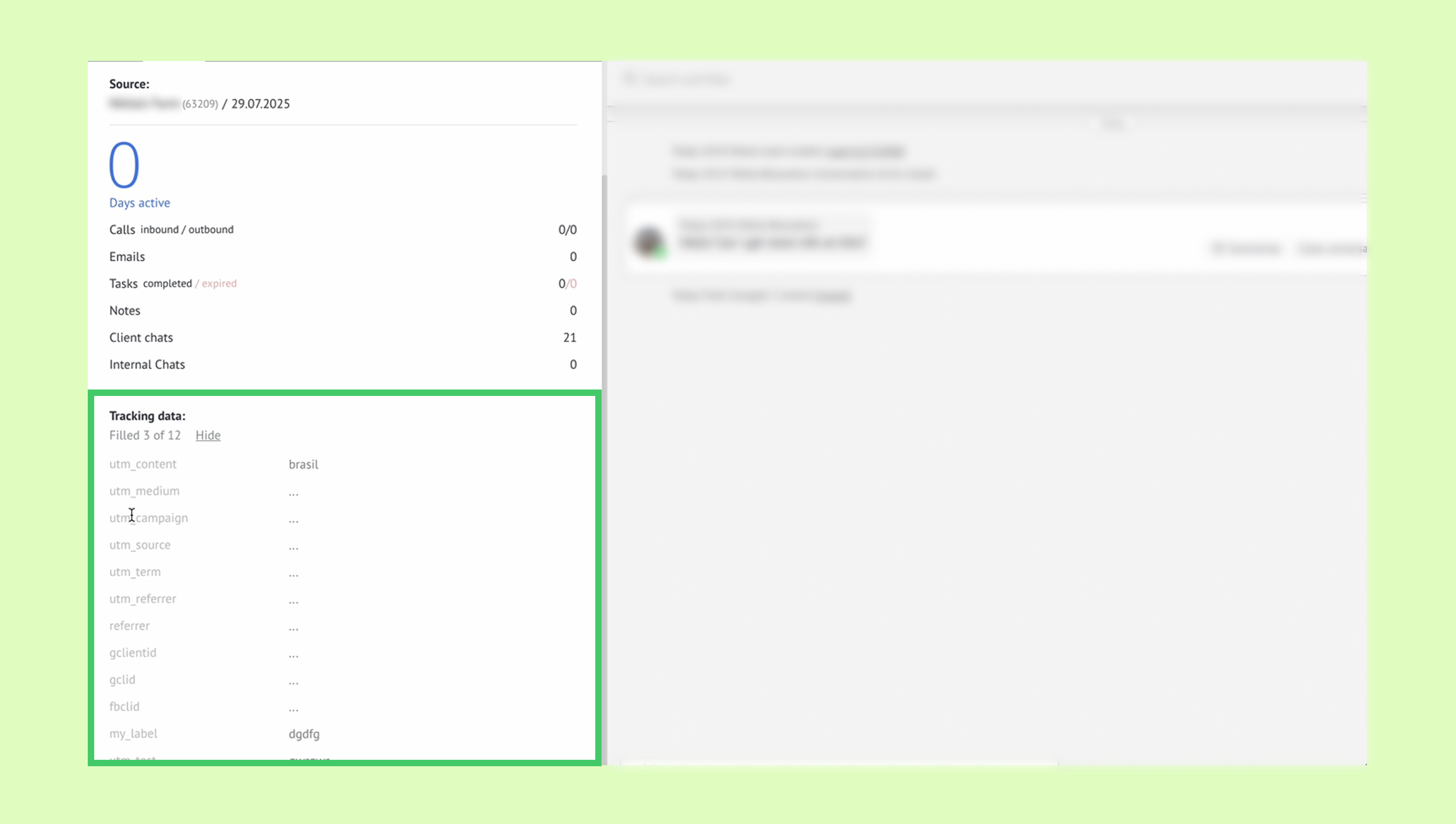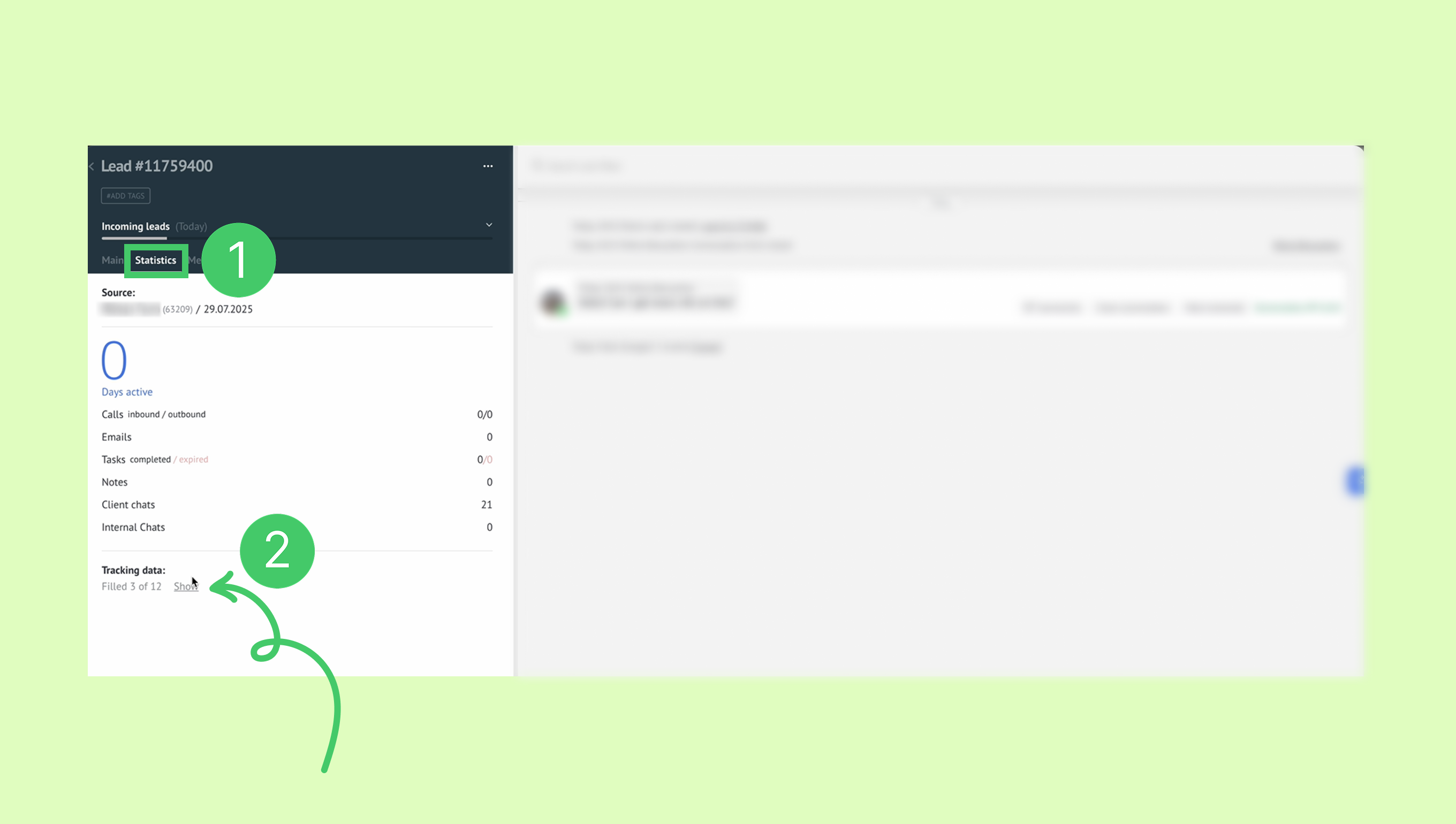 • UTM values appear in the Statistics → Tracking data tab of the lead card. Click Show to see the UTM tags from the ad.