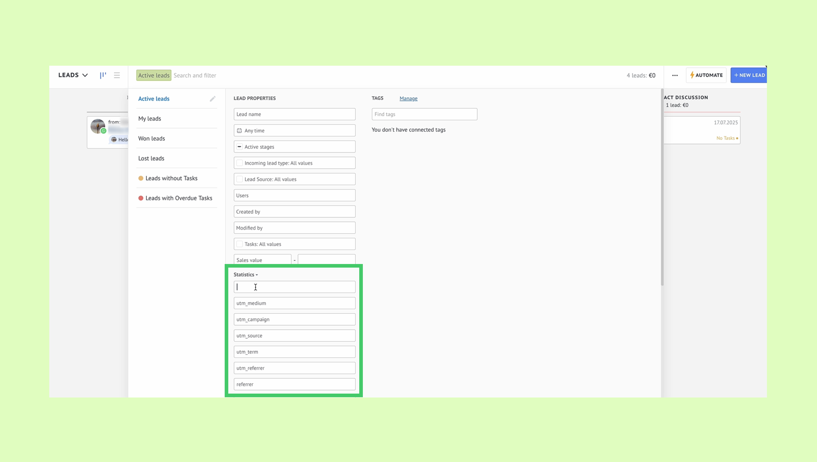 To evaluate performance, go to Leads → Search & filter and filter by UTM fields.