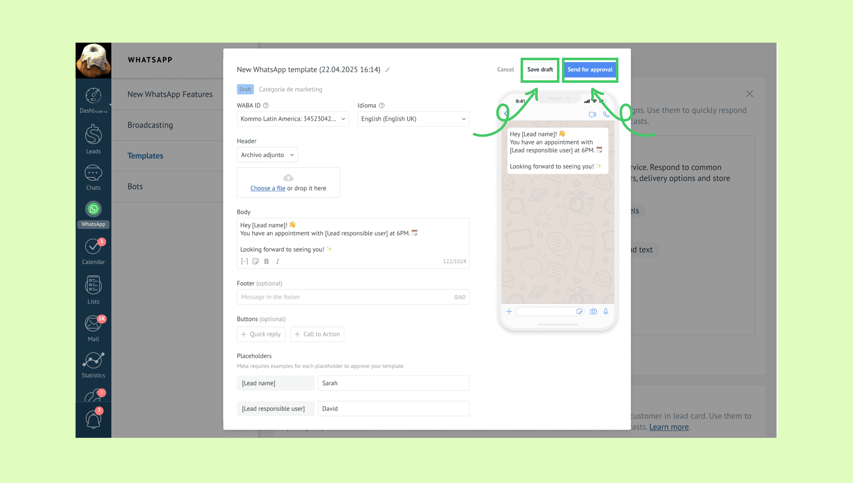 On the right side of the New WhatsApp template window, you’ll see placeholders. These are variables written in square brackets (e.g., [Lead name]). Placeholders automatically pull data from a lead, contact, or company card to personalize each message.