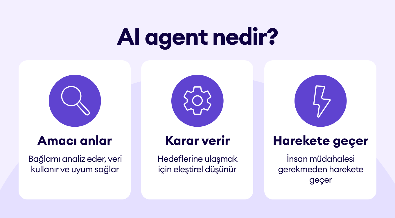 AI agent, kullanıcının amacını anlayan, kararlar alan ve bir hedefe ulaşmak için özerk olarak harekete geçen akıllı bir sistemdir. Temel otomasyon araçlarından farklı olarak, AI agent bağlamı analiz edebilir, verileri kullanabilir ve yanıtlarını gerçek zamanlı olarak uyarlayabilir.
