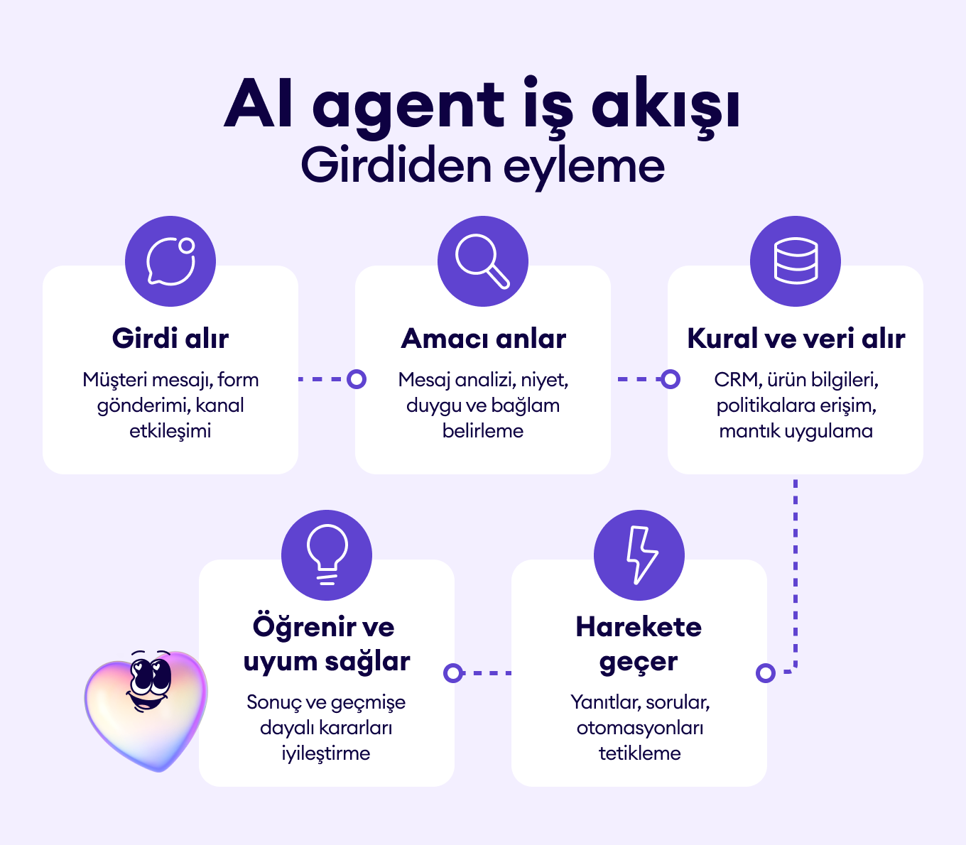 AI agent’lar, müşteri yolculuğu boyunca çok adımlı, hedef odaklı görevleri yönetmek için tasarlanmıştır.