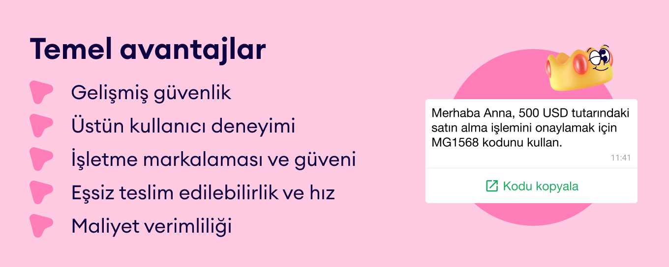 Kapsamlı şablon kitaplığı: WhatsApp, hesap doğrulama, işlem onayı ve sipariş takibi gibi önemli kullanım durumlarını kapsayan kapsamlı bir kimlik doğrulama şablon kitaplığı sunar.