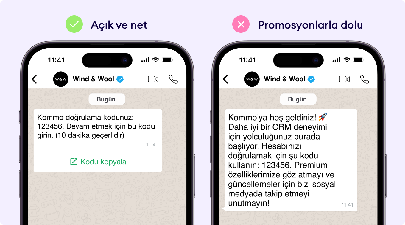 Açık olun: Mesajın amacını hemen belirtin. Örnek: “Kommo giriş kodunuz 123456'dır.” -
