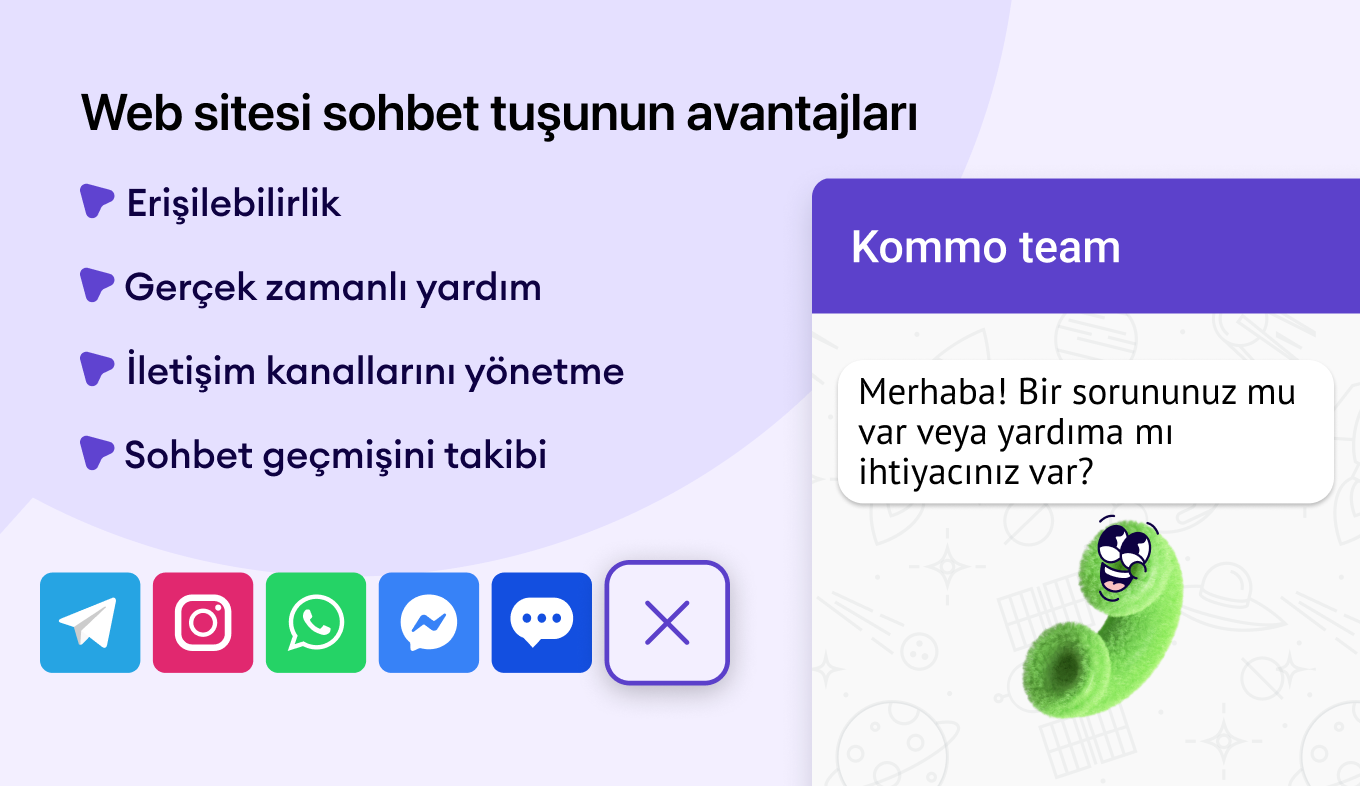 Kommo'nun web sitesi sohbet tuşunu kullanarak Facebook Messenger'ı doğrudan web sitenize entegre edin. Bu özellik, ziyaretçilerin sitenizden ayrılmadan ekibinizle sohbet başlatmasına olanak tanıyarak kullanıcı deneyimini ve müşteri yakalama oranını artırır.