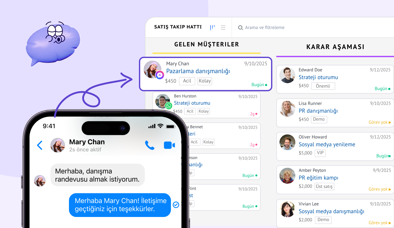Kommo ile Facebook İşletme Sayfanızdaki her yeni mesaj anında satış takip hattınıza müşteri olarak eklenir. Böylece hiçbir fırsat kaçmaz ve ekibiniz hemen yanıt verebilir.