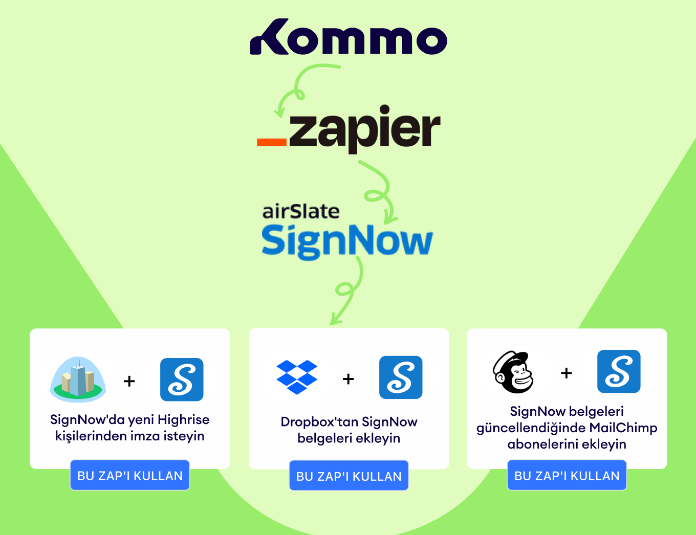 Kommo'daki Zapier entegrasyonu sayesinde, teklifler, sözleşmeler ve faturalar oluşturmak ve yönetmek için araçlar ile belge işleme çok kolay hale gelir. Örneğin, SignNow'u bağlayarak sözleşmeleri doğrudan Kommo'dan e-imza için gönderebilir, böylece idari işleri azaltabilir ve satış döngüsünü hızlandırabilirsiniz.