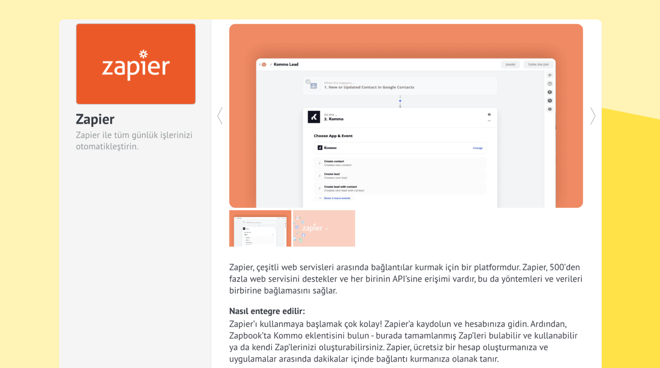 Kommo'nun Zapier entegrasyonu, CRM'inizi 2.000'den fazla uygulamaya bağlayarak otomasyonu basitleştirir ve kodlamayı ortadan kaldırır. Müşterileri yakalamaktan görevleri yönetmeye, belgeleri işlemeye ve ödemeleri gerçekleştirmeye kadar Zapier, tekrarlayan görevleri otomatikleştirerek, hataları azaltarak ve verilerinizin tüm araçlarda senkronize kalmasını sağlayarak iş akışlarınızı kolaylaştırır.
