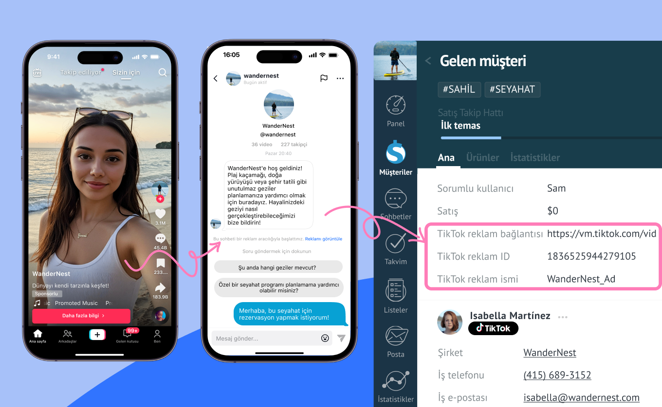 Her TikTok yorumunu, DM'i ve etkileşimi izlenebilir bir müşteriye dönüştürün, WhatsApp, Instagram ve Messenger gibi kanallarda senkronize edin, böylece tüm konuşmaları tek bir akıllı, otomatik merkezden yönetebilirsiniz.