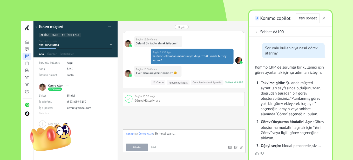 Kommo'nun yapay zeka destekli co-pilotu, CRM sistemi içinde gezinmenize yardımcı olur.