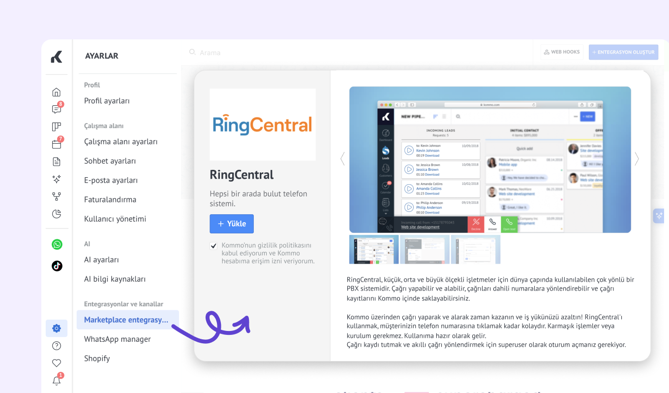 Kommo'da çeşitli mesajlaşma ve arama entegrasyonlarını bağlayın.