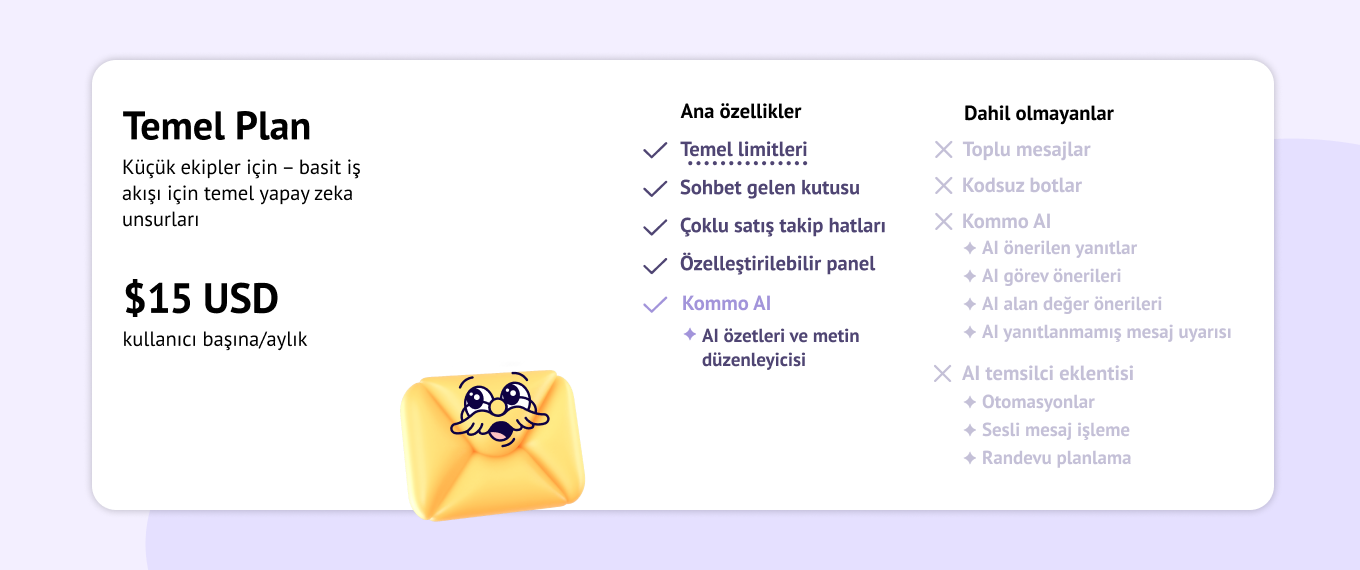 Her Kommo planı, büyümenizin her aşamasında maksimum değer sunmak için özenle tasarlanmıştır. AI destekli müşteri bilgileri ve akıllı konuşma takibinden otomatik takip işlemlerine kadar, her plan size en önemli araçları sunar, böylece ekstra iş yükü veya gereksiz maliyetler olmadan daha hızlı hareket edebilir, daha fazla anlaşma kazanabilir ve daha iyi sonuçlar elde edebilirsiniz.