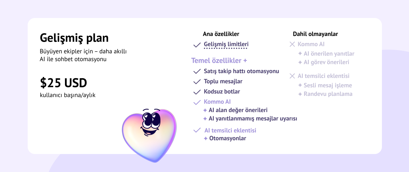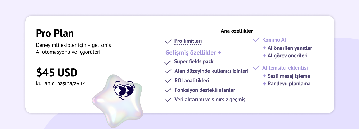 💡 İpucu: Kommo AI temsilcisini herhangi bir Kommo planına ücretli bir eklenti olarak ekleyebilirsiniz. Böylece planınızı değiştirmeden otomasyon seviyenizi yükseltebilirsiniz.