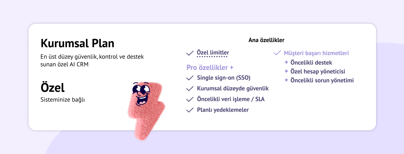 Kurumsal plan, özel kurulum, kurumsal düzeyde güvenlik ve öncelikli hizmet gerektiren karmaşık gereksinimleri olan kuruluşlar için tasarlanmıştır. Pro planındaki tüm özelliklerin yanı sıra tek oturum açma (SSO), gelişmiş güvenlik, SLA ile öncelikli veri işleme ve zamanlanmış yedeklemeler içerir.