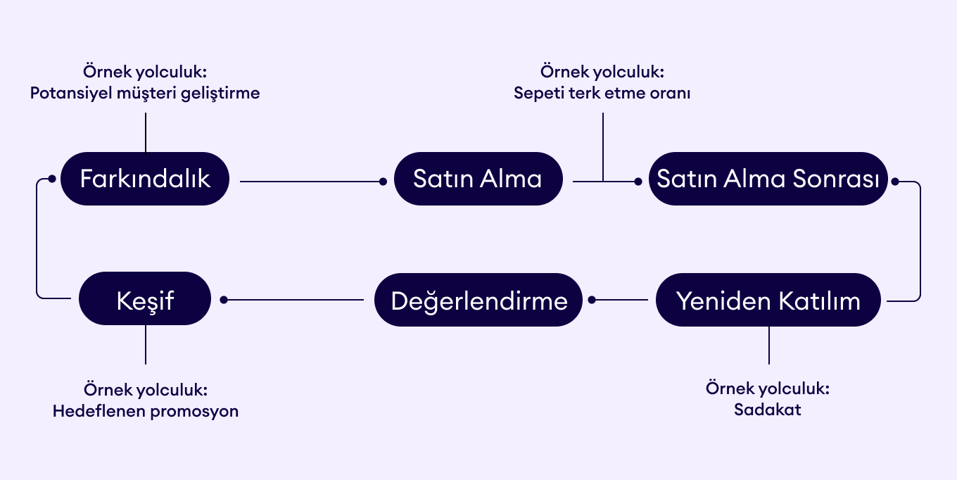 Müşteri yolculuğunu lineer bir yol değil, sürekli bir döngü olarak anlayın. Bu model, “keşif” aşamasından “satın alma sonrası” ve “yeniden etkileşim” aşamasına kadar olan önemli aşamaları gösterir ve her adımda hedefli pazarlama mesajlarıyla bağlantı kurma fırsatlarını vurgular.