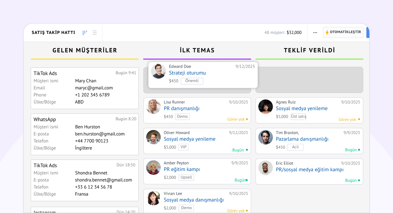 Sadece bir kişi yöneticisi olmaktan öte, akıllı satış takip hattı, otomasyon, satış istatistikleri ve WhatsApp, Instagram ve çok daha fazlası için birleşik bir gelen kutusu ile konuşmaları satışa dönüştürür!