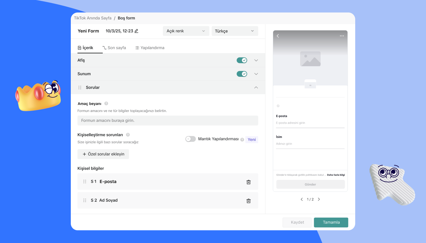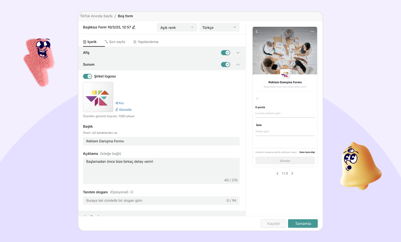 - TikTok Anlık Formlarınızı seçin > alanları eşleştirin > satış takip hatlarını ve etiketleri atayın
