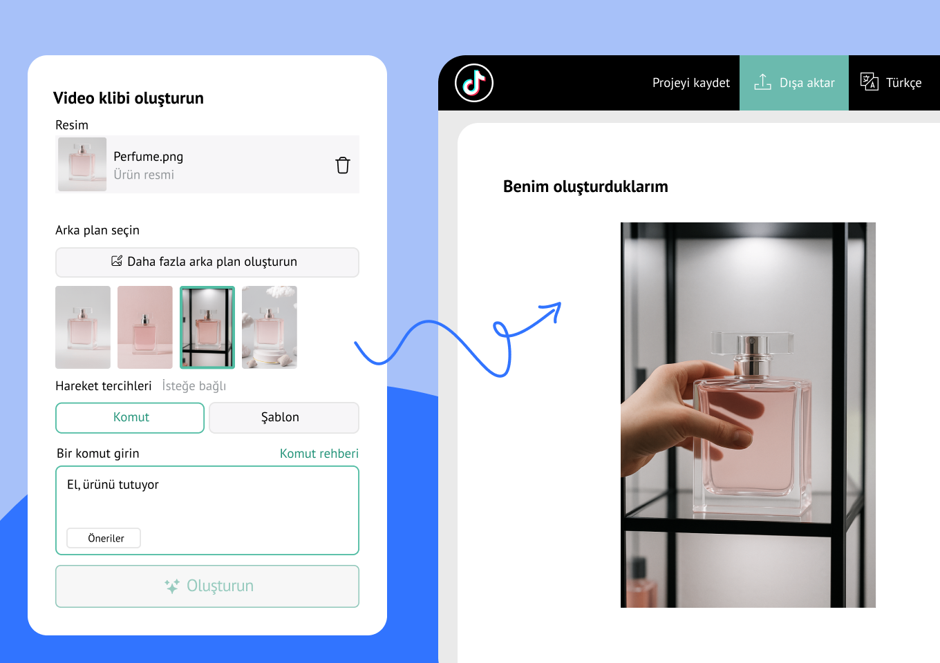 Görüntüden videoya özelliği, ürün fotoğraflarını, mood board'ları veya herhangi bir marka görüntüsünü şık videolara dönüştürmenizi sağlar.