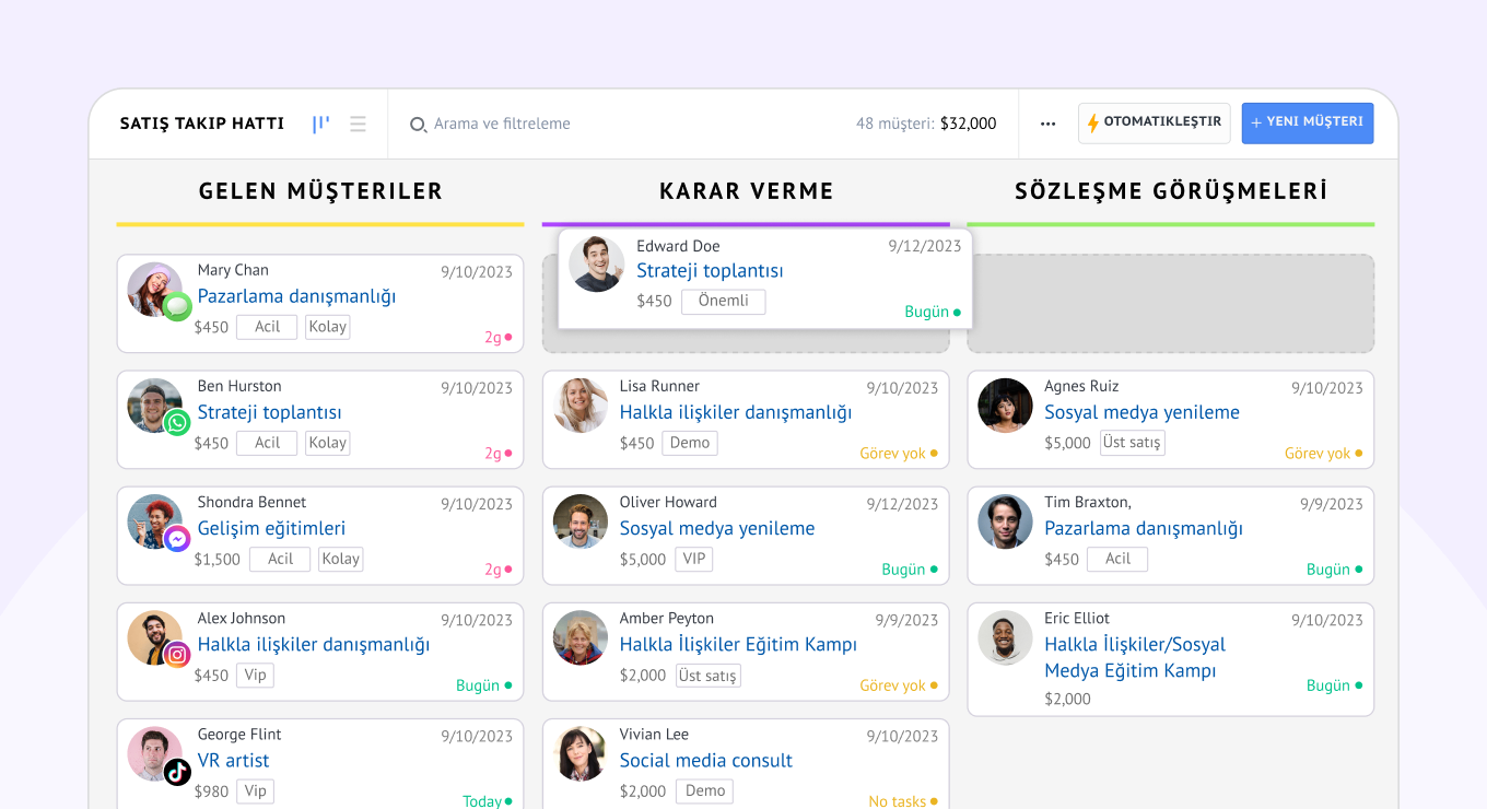 Müşterilerle daha etkili bir şekilde etkileşim kurmanıza, yüksek nitelikli potansiyel müşterilere öncelik vermenize ve anlaşmaları daha hızlı sonuçlandırmanıza yardımcı olur ⚡